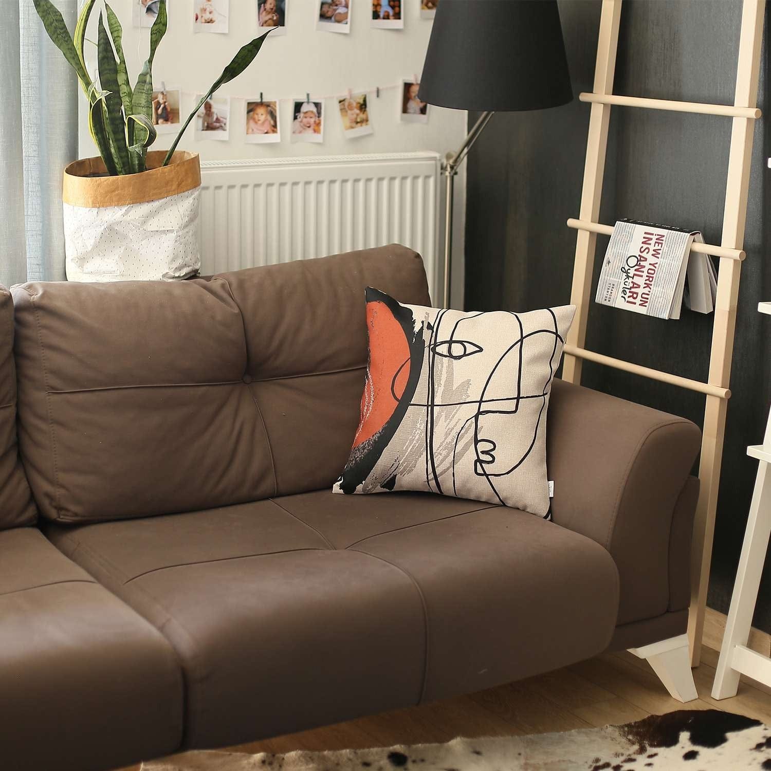 Add some boho-chic charm to your living space with this Red and Cream Abstract Strokes Throw Pillow. The bold linework of this piece is used to create an abstract face mural with red accents on the side over a soft ivory base to create visual intrigue. The unique charm of this pillow combined with a stylish color palette makes it ideal for an array of indoor styles. Hand-made by Turkish craftsmen, this pillow cover uses high-quality OEKO-TEX Standard 100 certified polyester fabric and has hidden zipper closures. It also sports a luxurious and high-quality poly filling inside for warmth and comfort. By only spot cleaning marks and blemishes, you’ll be able to keep this pillow looking seamlessly beautiful for ages. Pair this modern throw pillow with bold and dark colors to bring the whole look together. 18” x 18” x 1”