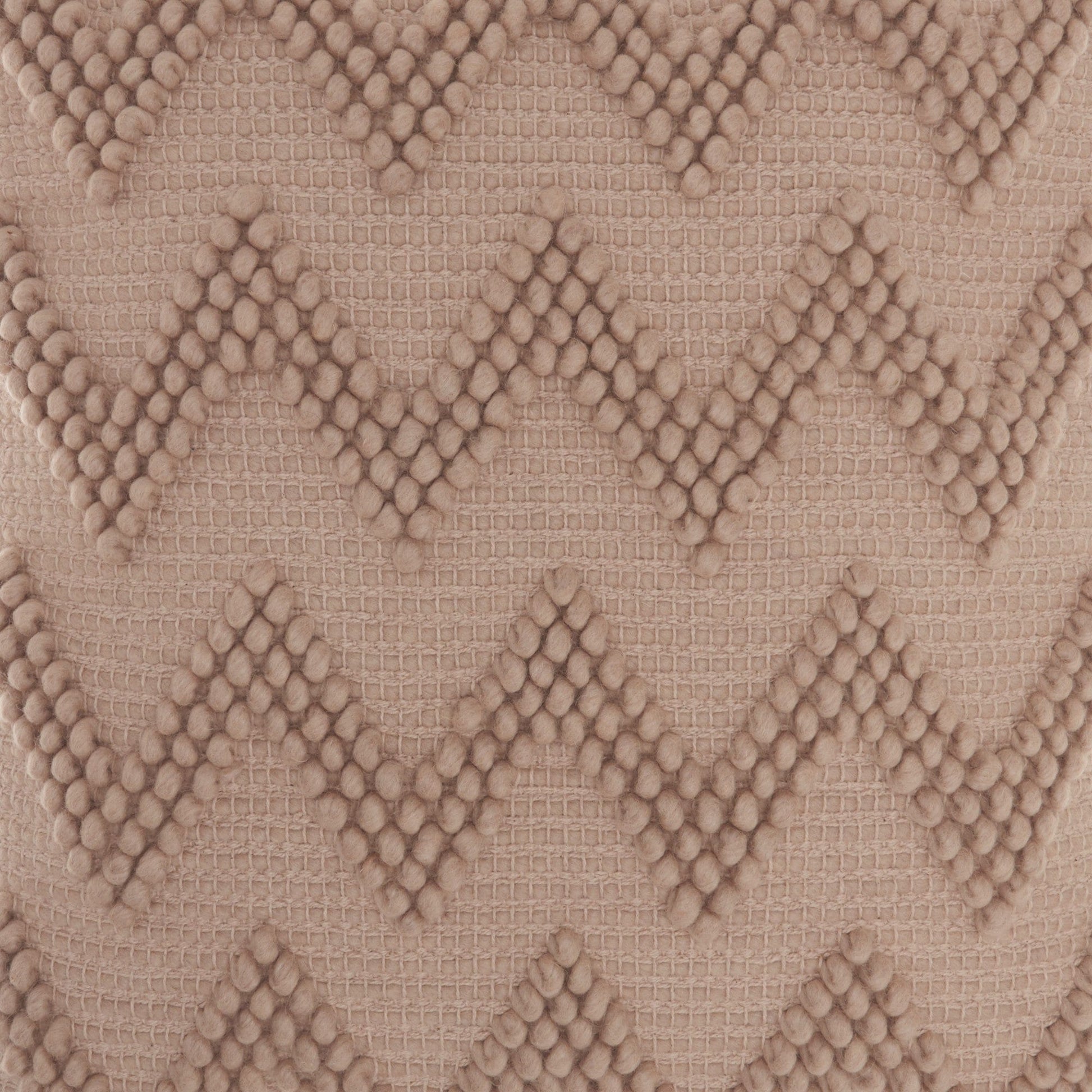 With this Rose Pink Chevron Detail Throw Pillow you can add the perfect finishing touch to your bed or your couch with a great combination of style and comfort. This pillow has a square shape and is covered in a textured rose pink colored fabric. This fabric serves as the perfect background for the detailed chevron pattern that is all along the front of this throw pillow. The chevron pattern is made of rose pink colored thread that is tightly wound in small circles. There are three layers of small circles in each of the chevron stripes which gives more depth and dimension to the overall look. This throw pillow will look great anywhere in your home and elevate the look of all the seating spaces you have. 6" H x 20" W x 20" D