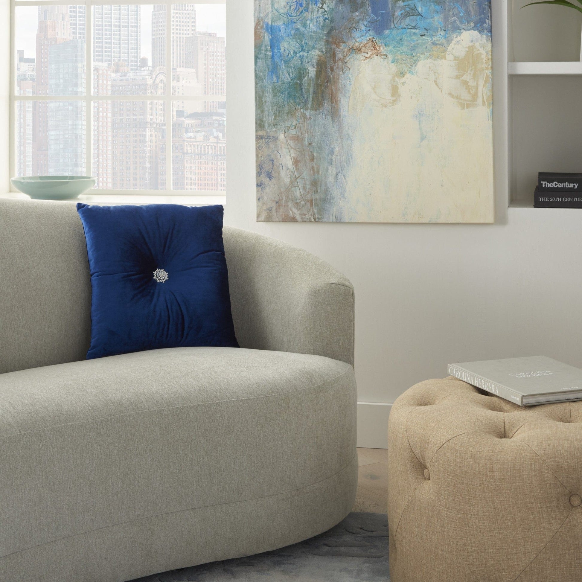 Make the most of your luxury aesthetic by adding this Royal Blue Embellished Throw Pillow to your seating spaces. This throw pillow has a square shape and is covered in a soft feel fabric in a stunning royal blue color. The fabric has a slight sheen to it which is exaggerated by the beaded embellishment in the middle. The beaded design in the middle acts as the top of a tufted design and creates a nice textural feel. Use this throw pillow in your bedroom, your favorite chair, or class up your couch with it. 5" H x 18" W x 18" D
