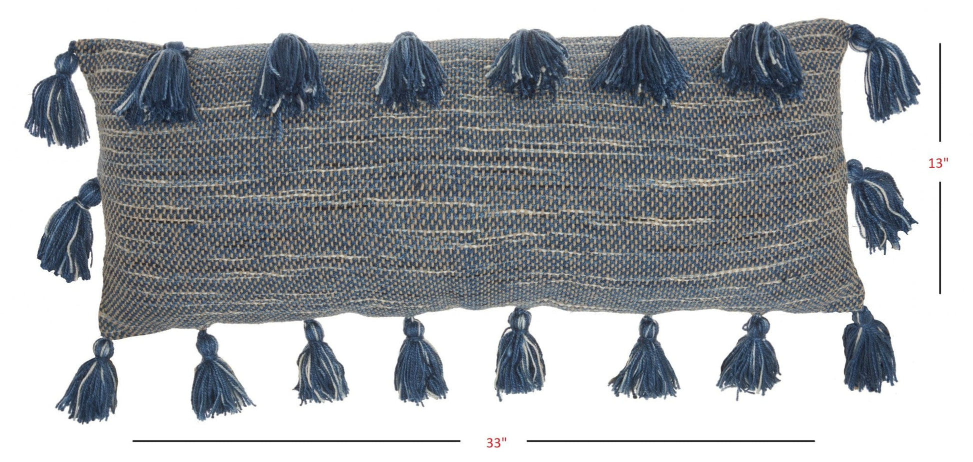 With this Royal Blue Tasseled Lumbar Pillow you can add a touch of minimal design to any seating space in your home all the while making it more comfortable. This pillow has a rectangular shape and is covered in a royal blue colored textured fabric. The texture on this fabric has a small square weave design which has white and mustard veining through it in some parts. Around the perimeter of this pillow there are royal blue colored tassels which add depth to the overall look of this cushion. You can use this lumbar pillow on your bed, on your couch, or even on your favorite chair. This minimal pillow will work with any colors or decor styles you already have in your home which makes it just so versatile. 5" H x 13" W x 33" D