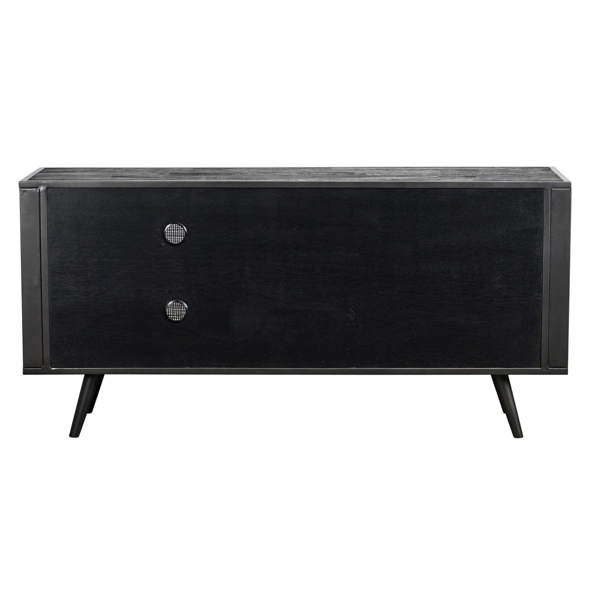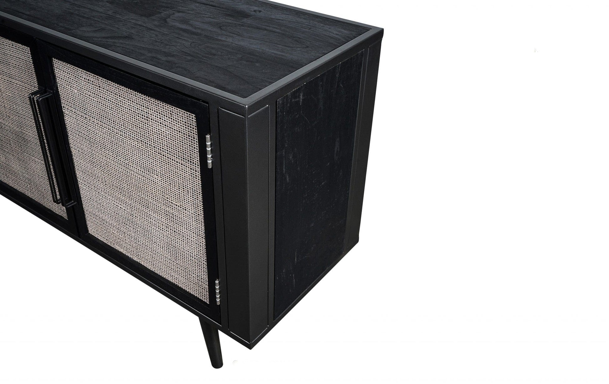 An amalgamation of vintage charm and excellent function the Rustic Black and Rattan Media Cabinet with Three Doors is a design of perfection. With a classic fusion of hardwoods and plywood with an iron framework and Rattan weave doors this cabinet makes a strong impact in any living room. The wide levelled table with three doors and fixed wide shelves provide ample room for all your entertainment components. A cord cut-out can be found behind one of the cupboards for easy cord managment. Beneath the black wash paint, one can also see the rough and rustic texture of the original wood. Handwoven rattan with vertical iron pull handles add a unique and natural esthetic to the doors making it the perfect addition in any room. The entire unit sits on four strong flared legs for added support and durability. Aside from obvious use as a TV and Media Center this great piece can also be used as a buffet server or storage cabinet in any room or hallway. 30.31" x 62.99" x 17.72"