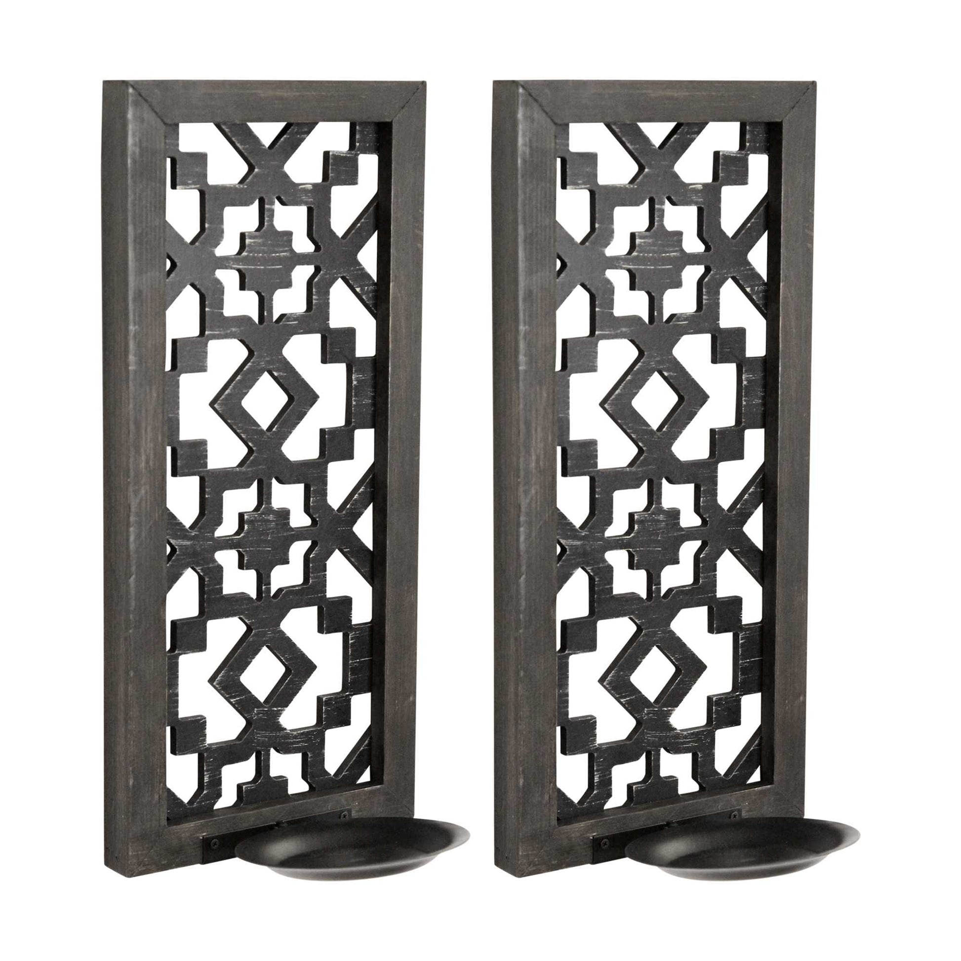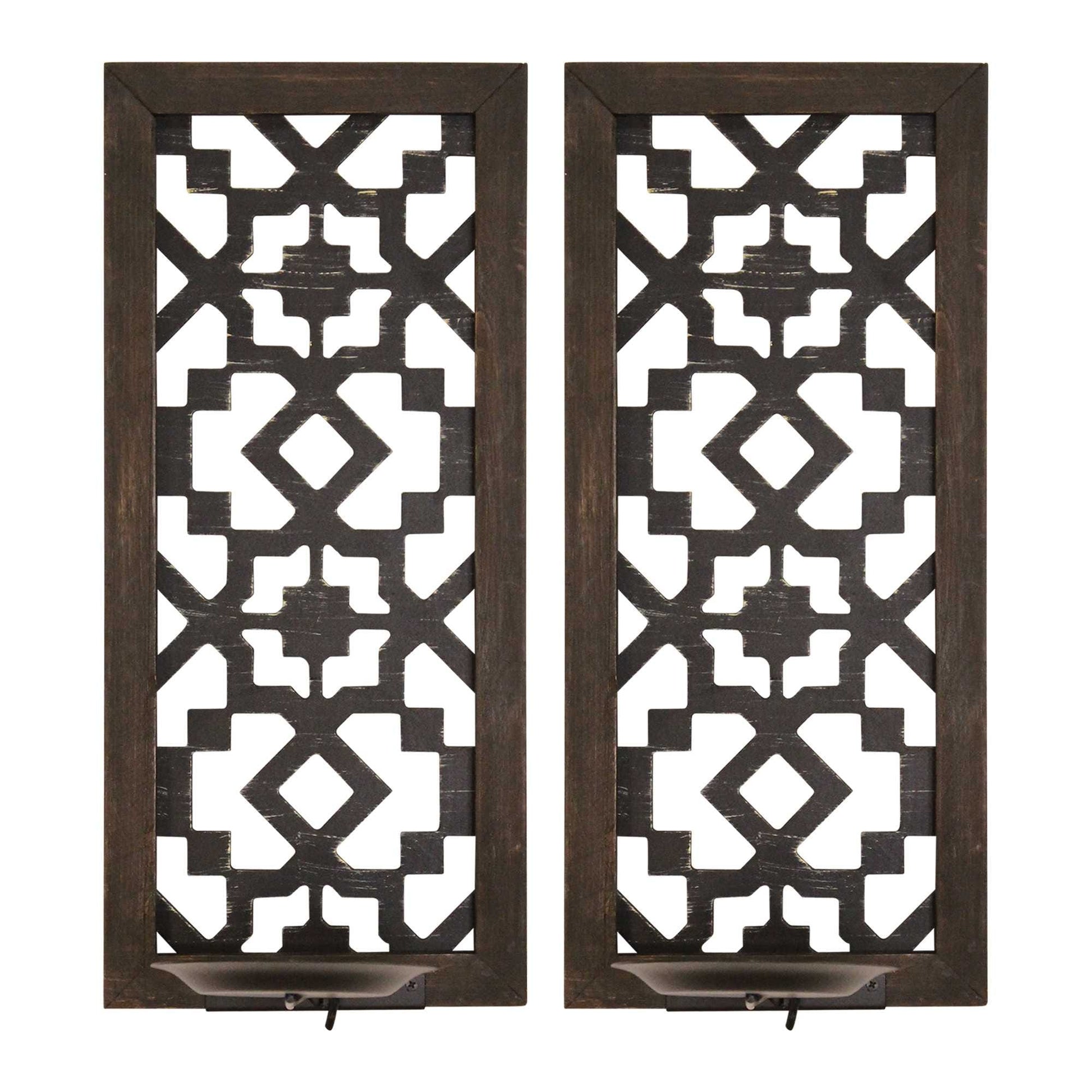Warm up any space with the Set of 2 Laser Cut Sconce. The dramatic black ornate laser cut pattern brings a bold look to any wall. Place LED candles on the handcrafted metal candle holders and enjoy the illumination. Each candle holder measures 6.75" W x 1" D x 15" H and come ready to hang. Theyre a perfect accent in a dining room, hallway or foyer. Using 3.50" diameter LED flameless candles is recommended (not included).