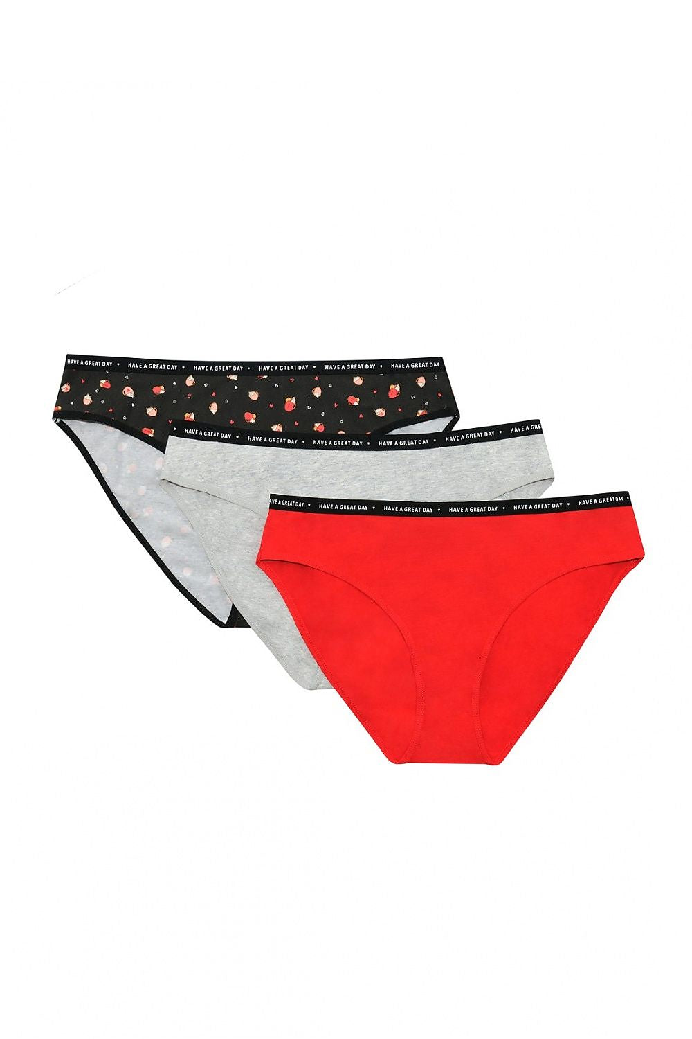 Sensational set of 3 pieces of cotton panties from the new collection Henderson Ladies. The version decorated with 1,5 cm black elastic waistband covered with Have a nice day print. It is a perfect everyday, slightly sporty base, which is so nice to jump into in the morning. The set includes light grey panties, smooth red and black covered with a sweet print. Recommended!
