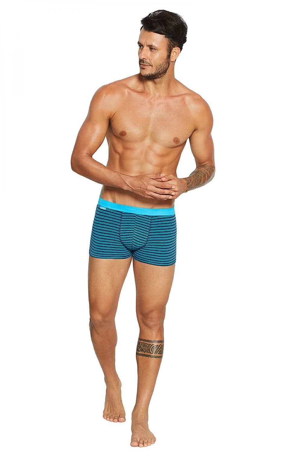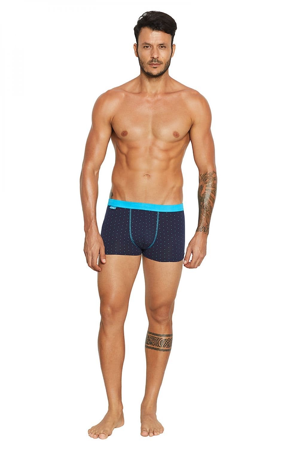 Set of 2 men's boxer shorts in navy blue. One striped, the other dotted, both trimmed with contrasting thread. Soft cotton knit. Smooth elastic waistband.