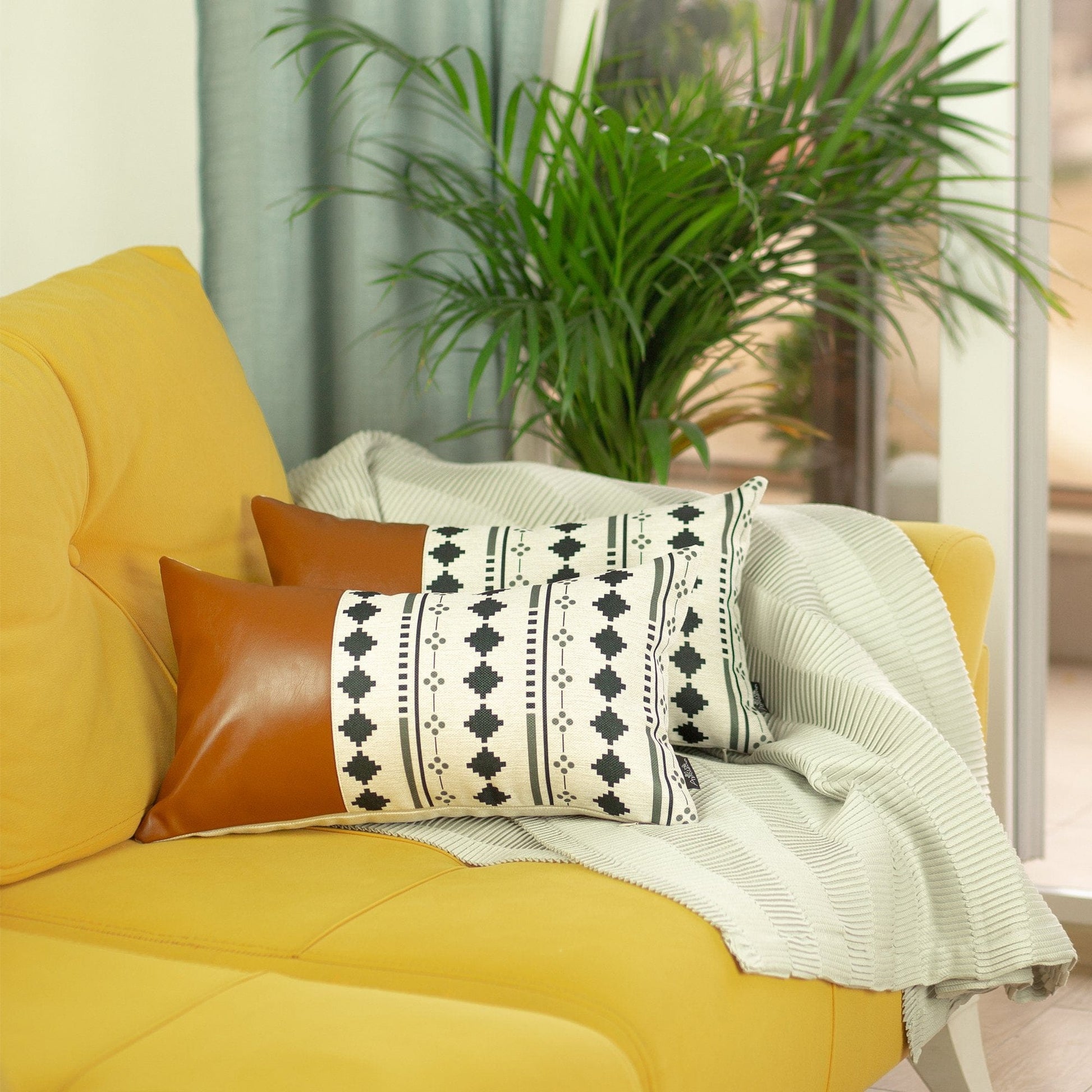 The Set of 2 Diamond Patterned and Brown Faux Leather Lumbar Pillow Covers showcases the profound artistry of the Turkish artisan that can instantly add color and warmth to any living space. With a well-balanced bohemian and modern creativity in its design, this pillow cover features a 100% polyester part with beautifully printed diamond patterns and an adjacent side with a rustic brown faux leather finish. A hidden zipper all-around gives a seamless finish on the touch. This set of 2 rectangular soft and comfortable lumbar pillow covers will serve as an excellent ornate accent on your sofa, chair, or bed, complementing its surrounding. 12” x 20” x 0.08”