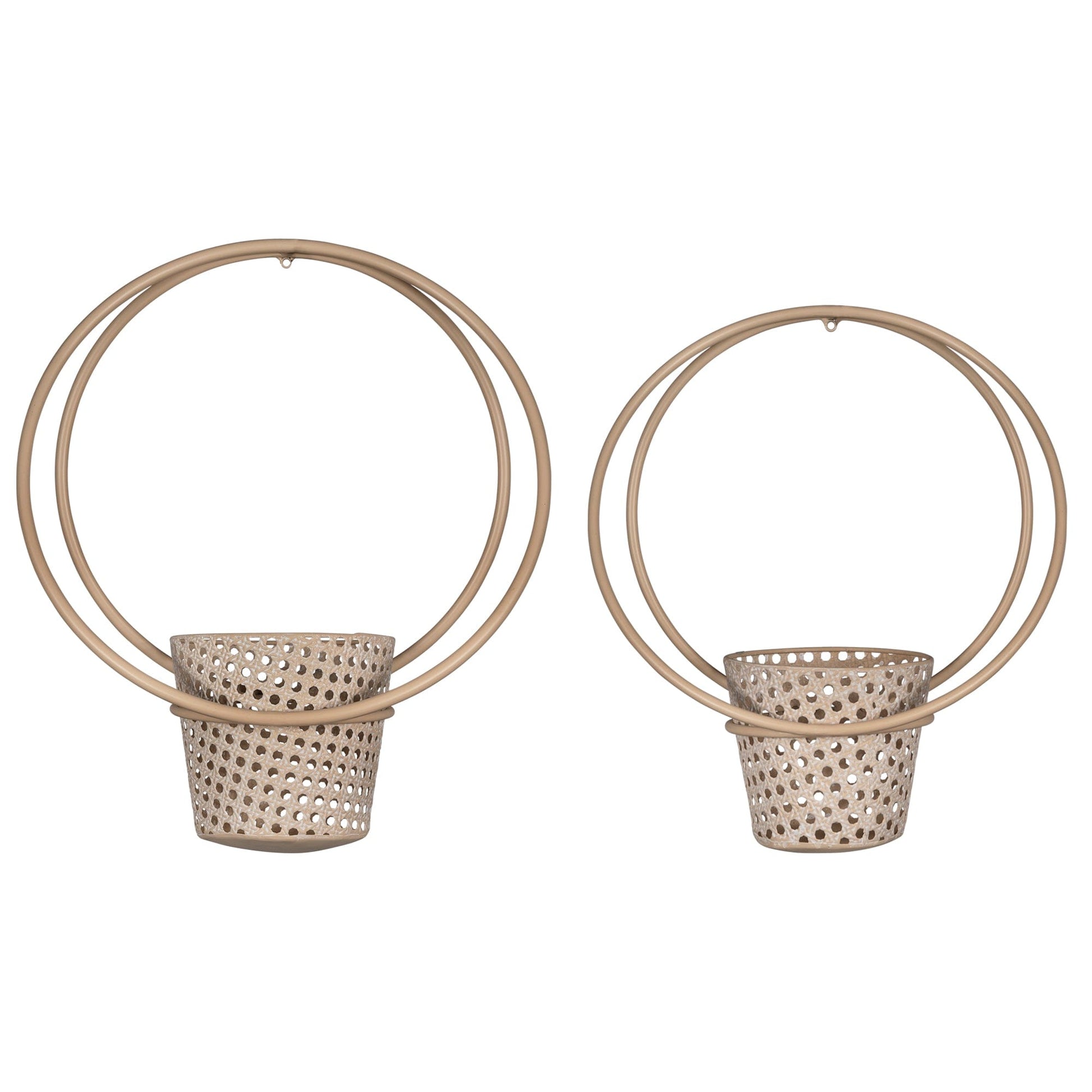 Decorating your living room with faux plants, flowers, and shrubs will add a punch of colors into the space making your interior look lively and refreshed. Bring in the sense of tranquility wrapped in modern sophistication with this Set of 2 Metallic Cane Wall Planters in your home. This set features 2 metal plant pots in a pale peach tone with a white-washed finish that looks soothing to the eyes and the intricately designed dotted holes on the surface add texture to each piece. The two big circular frames lend a contemporary touch when mounted on the walls. Each of the planters is made of 100% metal to last long in your interior and seamlessly blend in with your modern decor. 17.13” x 14.76” x 7.09”