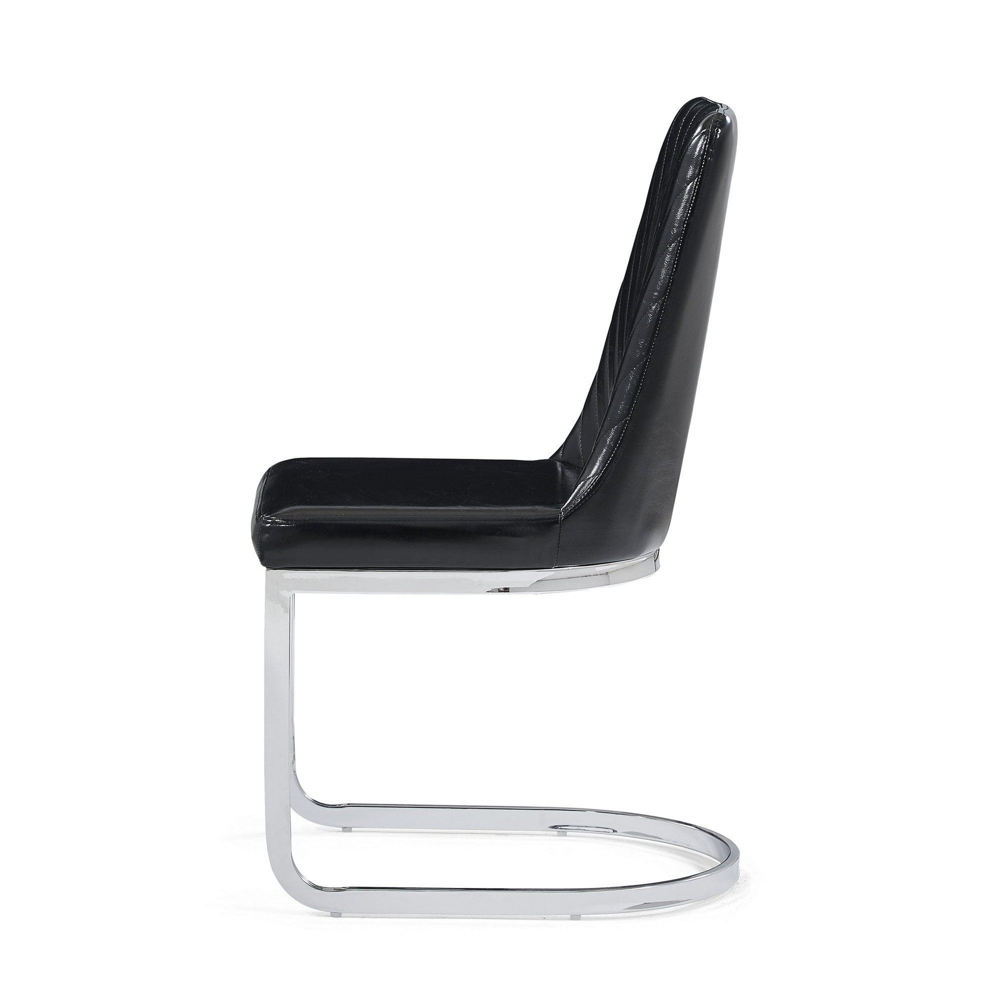 Perfect for your kitchen or breakfast nook, this chic dining chair will transform your room and add comfort and a touch of elegance. This chair is upholstered in tones of deep black faux leather (PU) with chevron embedded back design, providing an eye-catching and contemporary twist to traditional kitchen seating. Decorating possibilities are endless with the attractive tones of this chair. Additional It include horseshoe style chrome toned rounded metal base and ample padding, continuing the delightful look and comfy feel of this seating. Quality craftsmanship in every facet of production ensures durability and long-lasting wear. For an attractive, modern take on kitchen or dining room furnishings, this chair is a can’t miss choice in comfortable seating.