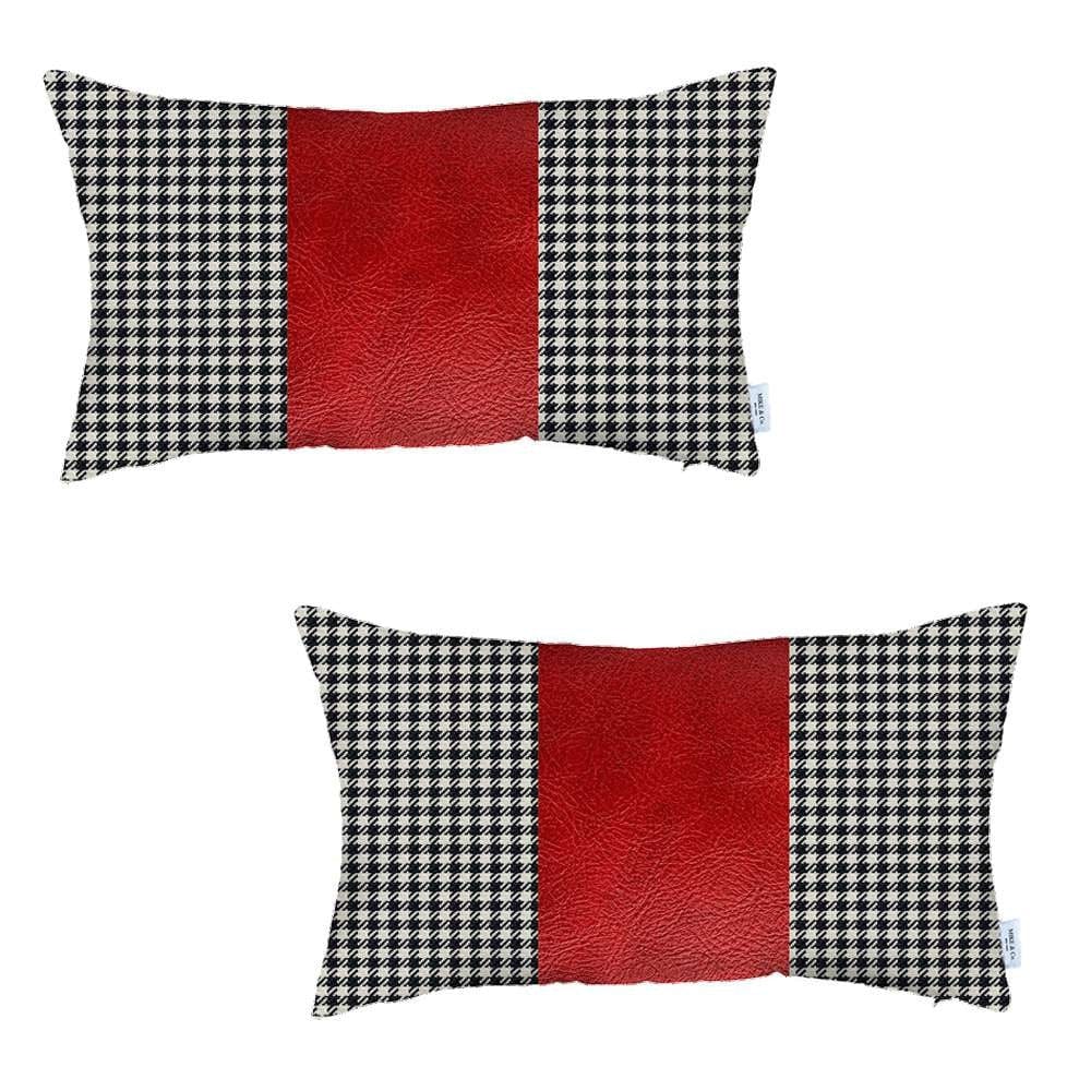 Captivating the bohemian vibe in a timeless design pattern, this Set of 2 Red Houndstooth Lumbar Pillow Covers will transform the styling of your contemporary home. The classic houndstooth checkered pattern in black and white as the base with an apple red vegan faux leather section in the center accentuates a countryside appeal. Flaunting the rich craftsmanship of the Turkish artisans, this pillow cover is made of 100% polyester with faux leather. The fabric is ensured to be optimally safe with its OEKO-TEX Standard 100 certification. It should only be spot cleaned to keep its color and sheen for long. For a smooth and sumptuous feel on the touch, the cover sports an all-around hidden zipper closure. Pair this beautiful set of 2 pillow covers with any color scheme and it will effortlessly enhance the aesthetics of any interior setting. 12” x20” each. Set of 2.