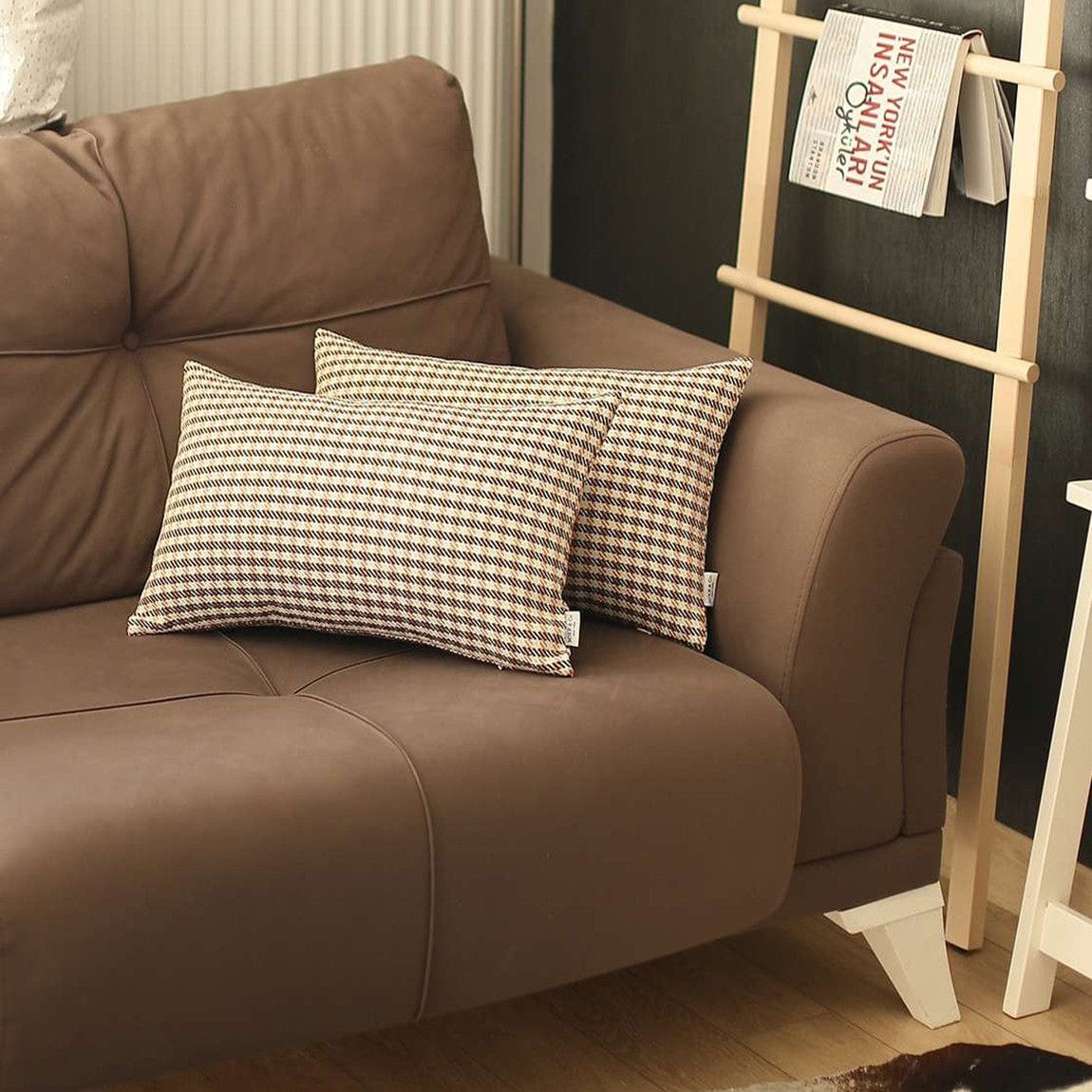 Upholding a rich and luxurious vibe, this Set of 2 Tan Houndstooth Lumbar Pillow Covers will be a sophisticated addition to any modern or contemporary setting. Featuring the classy houndstooth checkered pattern in tan over a cream-toned base, each cover accentuates an elegant combination. Made with care by Turkish artisans, these pillow covers are handmade of OEKO-TEX Standard 100 certified polyester fabric to ensure quality and product safety that will last for ages with low maintenance. The hidden zipper closure adds to a smooth finish for a soft and sumptuous feel on the touch. Besides serving as a sophisticated accent to complement any furniture, this set of 2 lumbar pillow covers will enrich the ambiance of any modern or contemporary living space. 12” x 20” each. Set of 2.