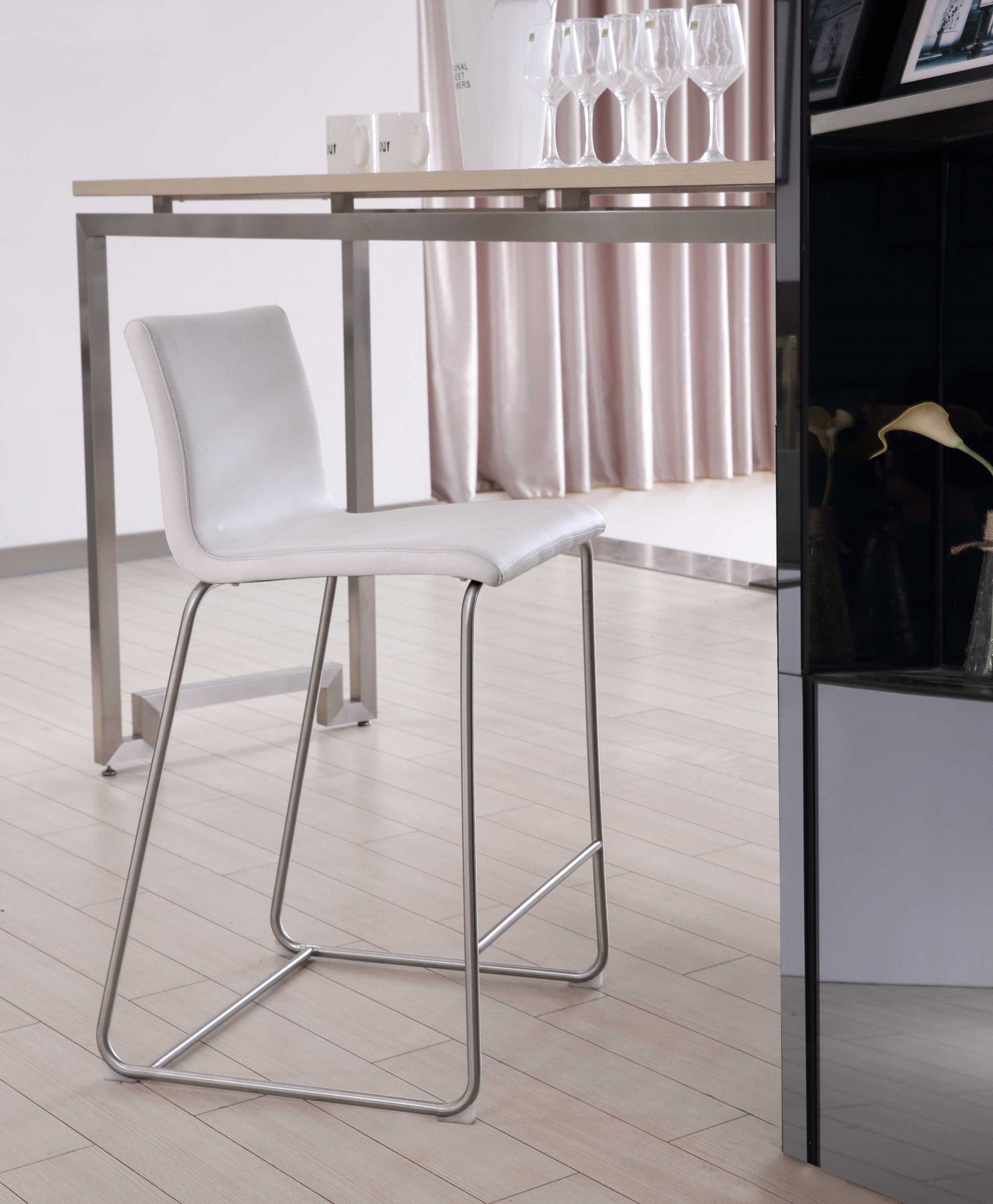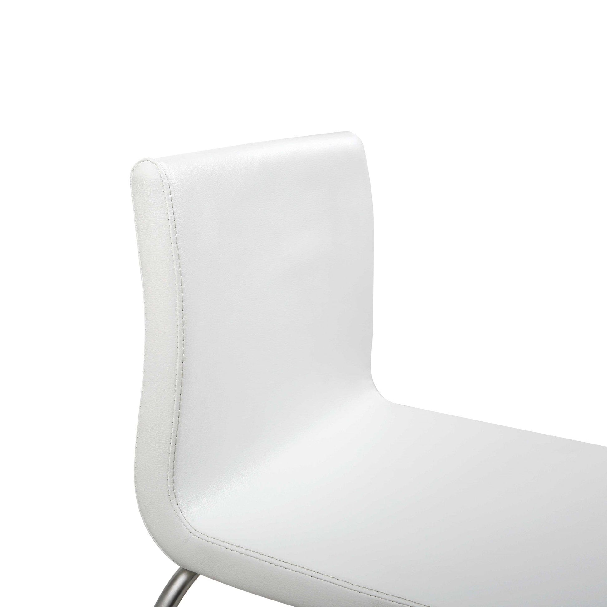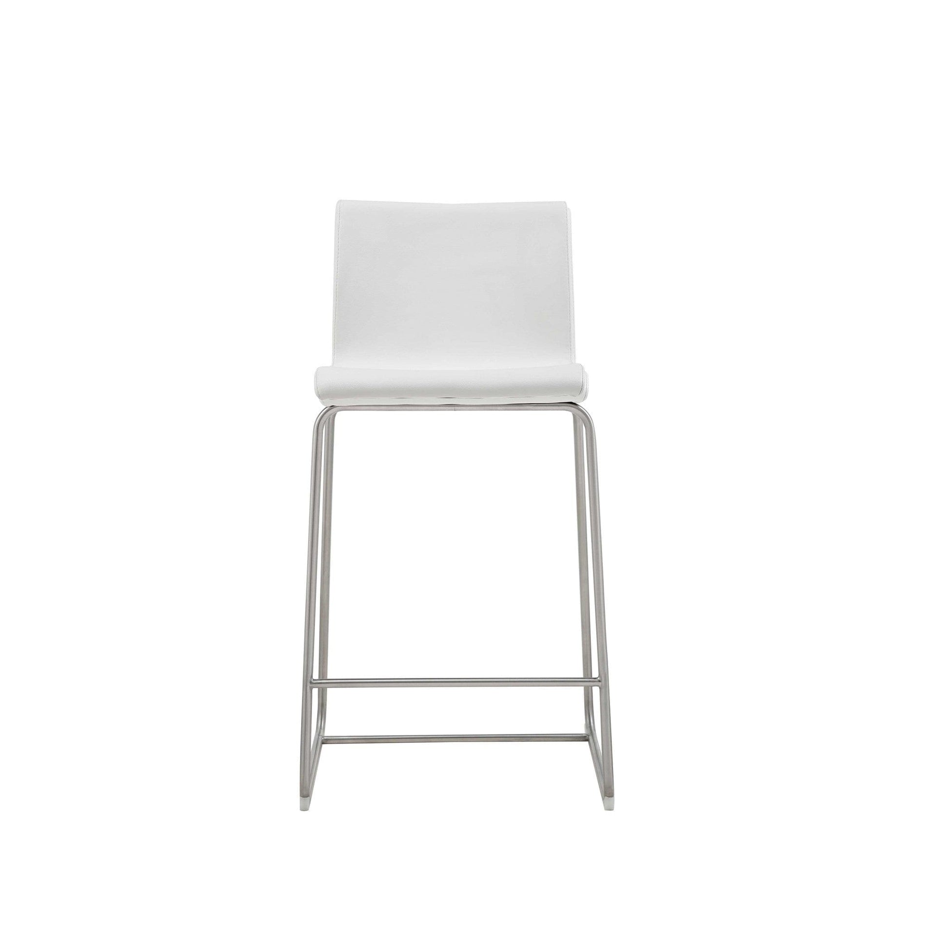 Modern, sleek, and space conscious. This stylish square shape bar/counter stools is the definition of contemporary design and simplicity. Is offered in a beautiful white faux leather upholstery on strong, and elegant stainless steel legs. This stool features a plush, medium firm, seat and back, fixed 26" height, and footrest, built for both comfort and style. Clean lines, and chicness are the inspiration for our line of dining and lounge furnishings, offering multiple uses for one piece. This versatile counterstools can be used as added seating in reception rooms, guest rooms, living and lounge areas, dining rooms, breakfast nooks, and any other place in need of an update. Set of 2.