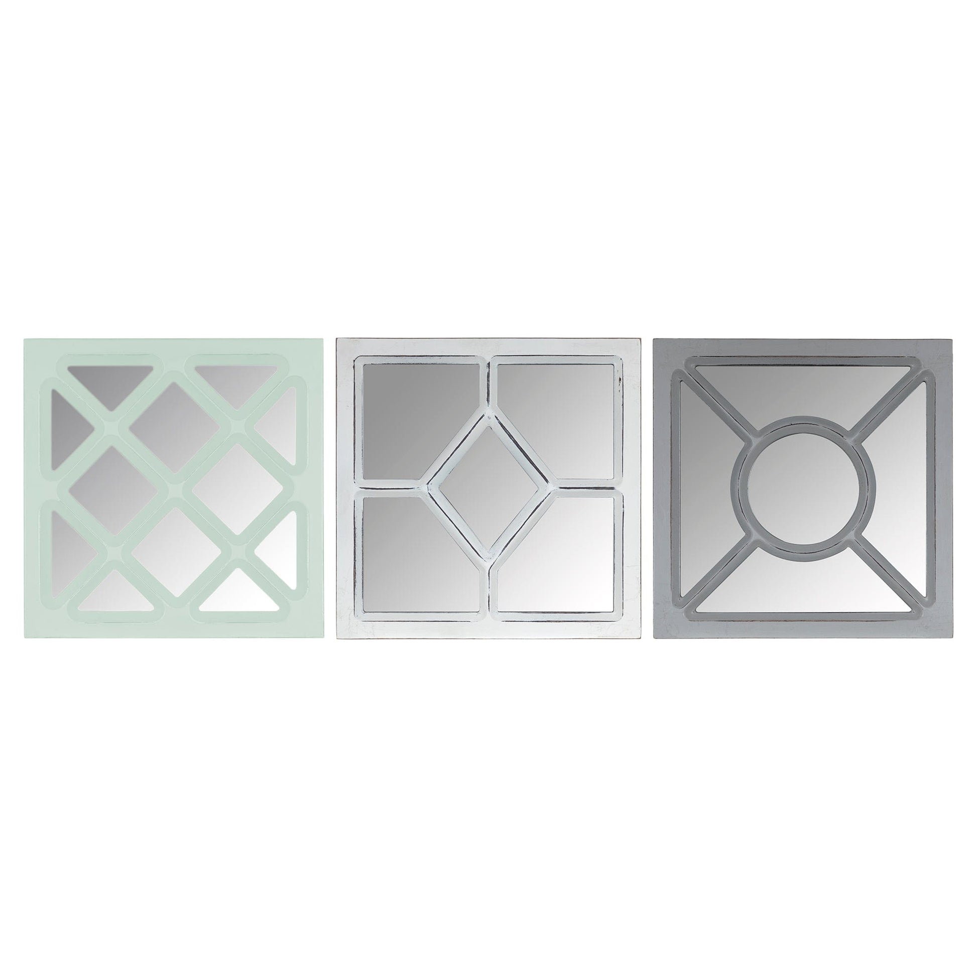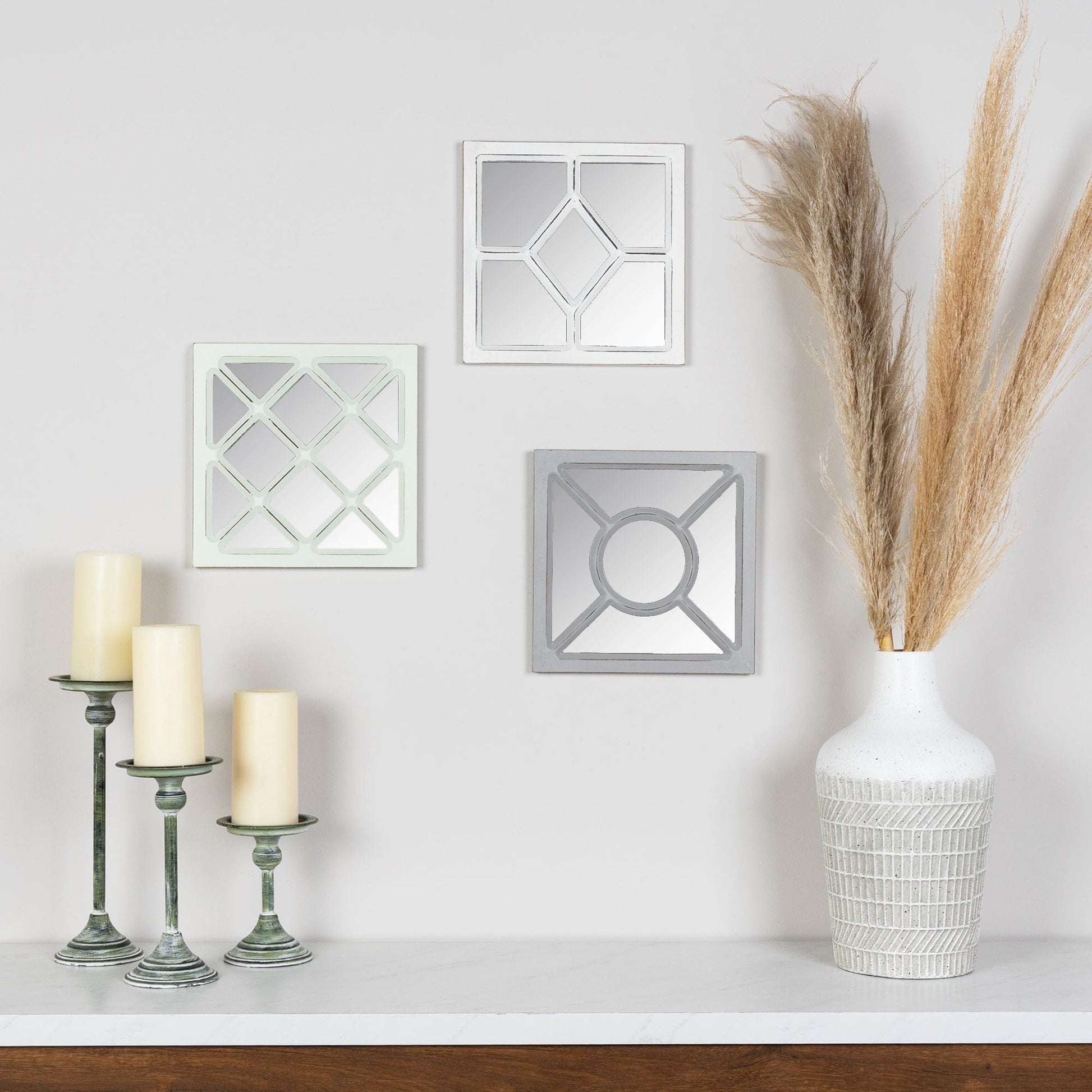 Give your interior a light-bosting effect with this Set of 3 Geometric Wall Mirrors that will not only reflect the light for visual interest but also add a contemporary edge to your space. This set features 3 pieces in pastel hues of gray, green, and white with geometric design patterns to blend in with any modern interior. Made of 60% MDF and 40% glass, this sophisticated set of wall mirrors will add a dimension to the bare walls of your living room, hallway, or dining space, making it come to life in an instant. If you want a unique addition to your place and brighten up the ambiance, this tri-colored set of wall mirrors will do the wonders to make you impressed. 10” x 10” x 1”