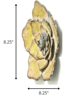 Create an impression that lasts long by making a grand statement in home decor with our rustic flower wall decor. This beautiful piece features three handcrafted metal flower pieces and hand-painted in blue, ivory and yellow respectively to elicit a chic visual vibes in any room. Whether you need a unique wall art in your study, dressing room or living room, this stunning art will perfectly accentuate any room decor. Rustic style 100% Metal One keyhole hanging method Vertical hanging orientation Wipe clean with damp cloth - Item is handmade and painted by skilled artisans - Product may have some variances in comparison to photo shown. It measures 8.25" X 1" X 8.25".