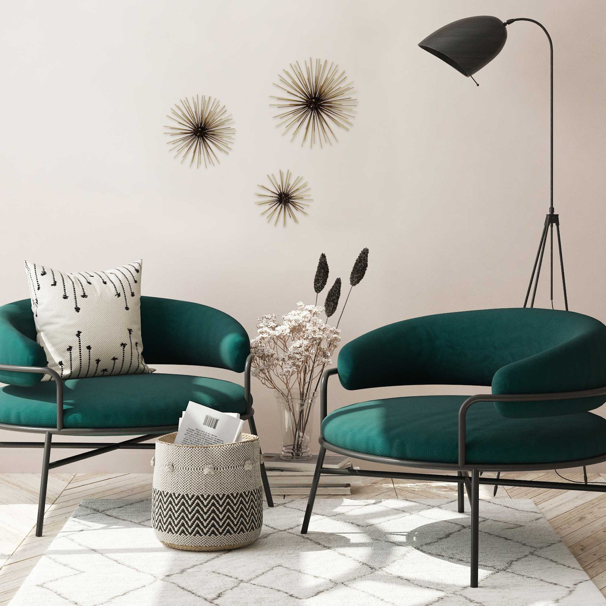 A contemporary art piece that transcends to a wide audience. Masterfully crafted of superior quality metal, this Starburst Black and Gold Metal Wall Art is a fashionable and trendy way to update your space. The set of three 3D spiky starburst sculptures with an ombre effect in the center bring dimension, color, and new site lines to your room. 10" X 3.5" X 10".