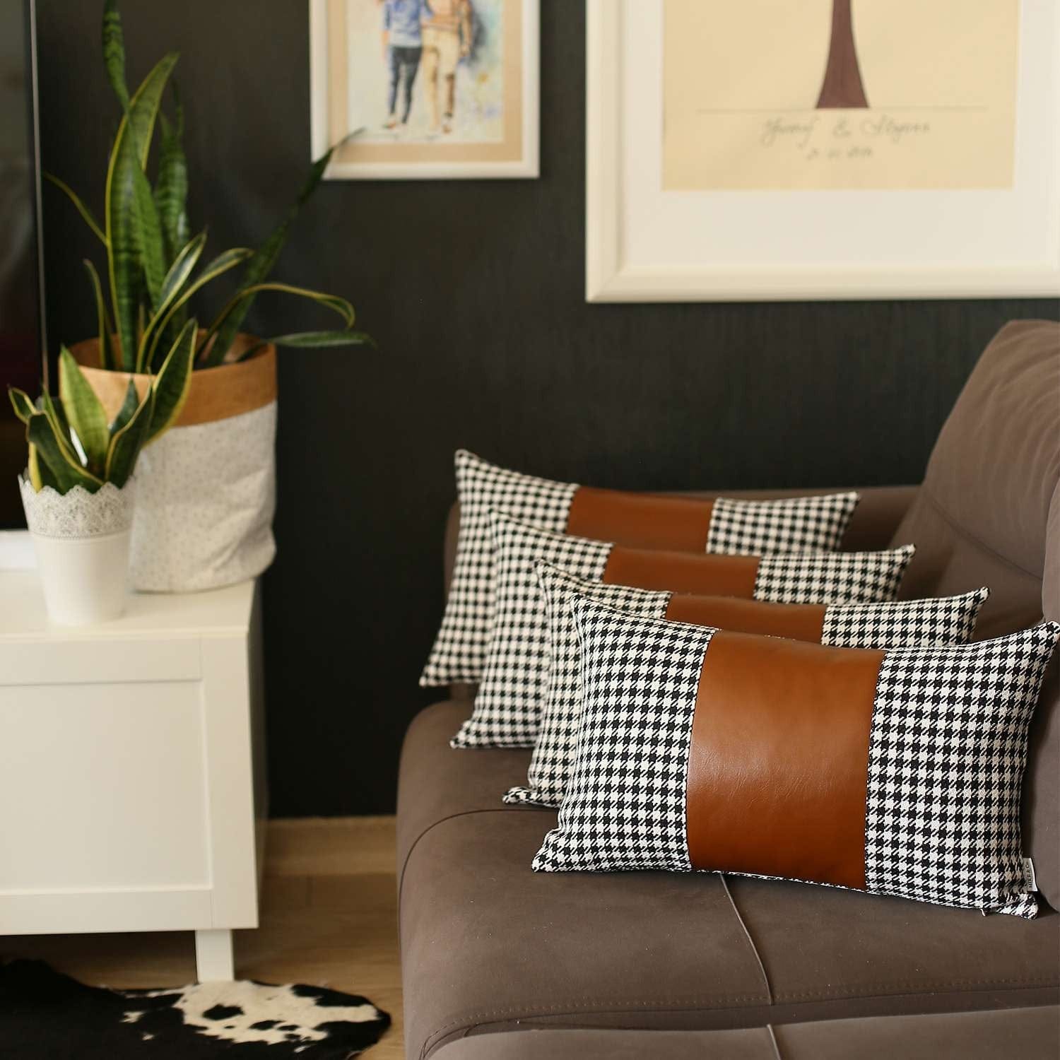 Captivating the bohemian vibe in a timeless design pattern, this Set of 4 Brown Houndstooth Lumbar Pillow Covers will transform the styling of your contemporary home. The classic houndstooth checkered pattern in black and white as the base with the rustic brown vegan faux leather section in the center accentuates a countryside appeal. Flaunting the rich craftsmanship of the Turkish artisans, this pillow cover is made of 100% polyester with faux leather. The fabric is ensured to be optimally safe with its OEKO-TEX Standard 100 certification. It should only be spot cleaned to keep its color and sheen for long. For a smooth and sumptuous feel on the touch, the cover sports an all-around hidden zipper closure. Pair this beautiful set of 4 pillow covers with any color scheme and it will effortlessly enhance the aesthetics of any interior setting. 12” x20” each. Set of 4.