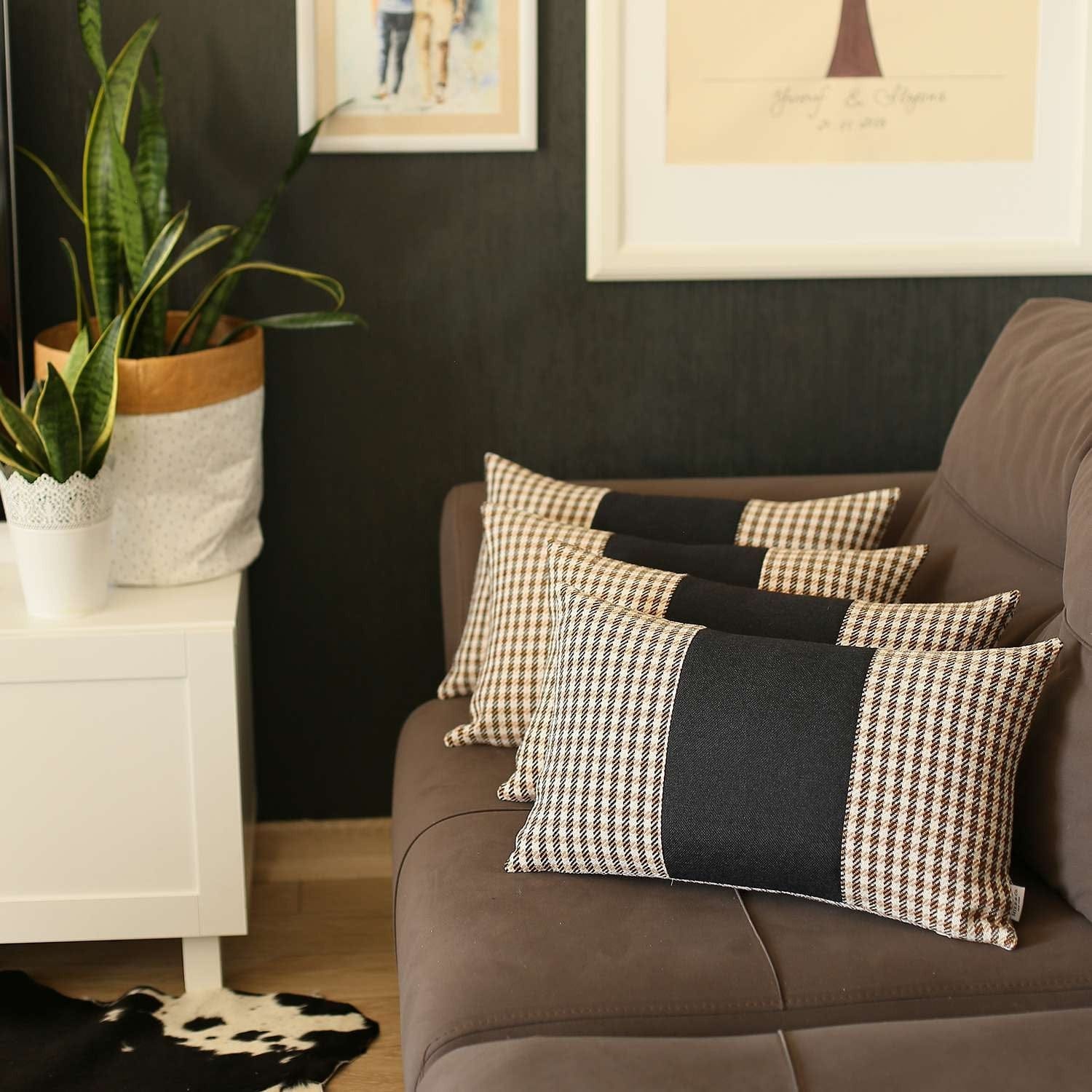 Flaunting a timeless pattern in a sophisticated color palette, this Set of 4 Tan Houndstooth Lumbar Pillow Covers will make your modern home feel welcoming and elegant. The tan and white jacquard weaved houndstooth pattern with a matte black vertical center strip adds a stylish appeal to the piece. Master Turkish craftsmanship combined with OEKO-TEX Standard 100 certified polyester fabric ensures product safety and durability. To make sure this pillow stays beautiful, it only needs to be spot cleaned. Keeping the whole look seamless and uniform, the zipper is kept out of sight in its hidden closure. Pair this classy set of 4 pillow covers with a bold or neutral color scheme and it will effortlessly blend in without overpowering its surrounding. 12” x 20” each. Set of 4.