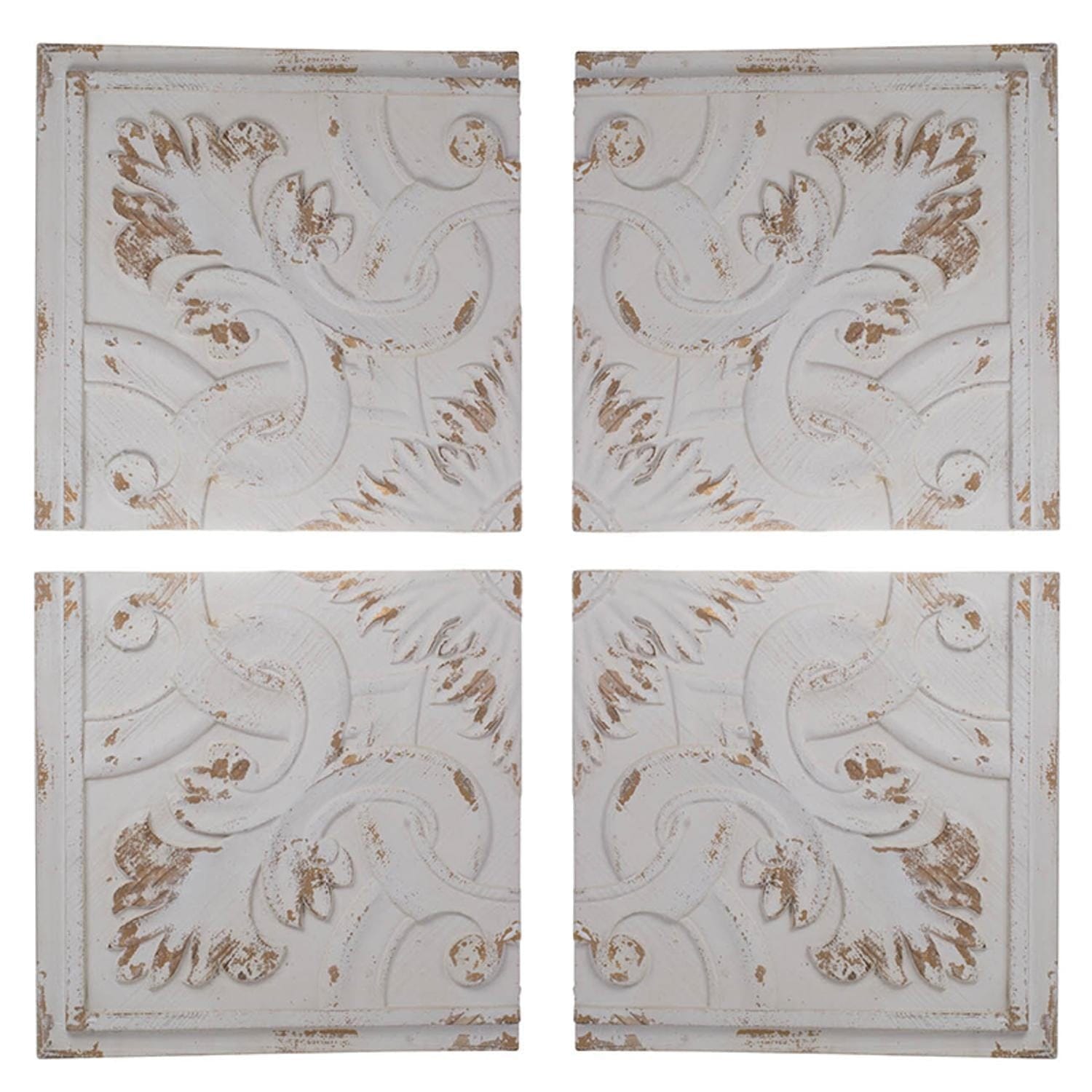 The visual aesthetic of this Set of 4 Whitewashed Arabesque Carved Wall Art will lend an updated farmhouse appeal to your home. Exhibiting a whitewashed finish with textured arabesque patterns and hints of gold dust peaking through for visual interest. Constructed from 100% natural wood these panels in their white washed and distressed finish will look charming in your space. You decide how you want to display them and how close you will hang them together. These four beautifully embellished panels will blend in with your interior decor. 17.5” x 1.5” x 17.5” each. Set of 4.