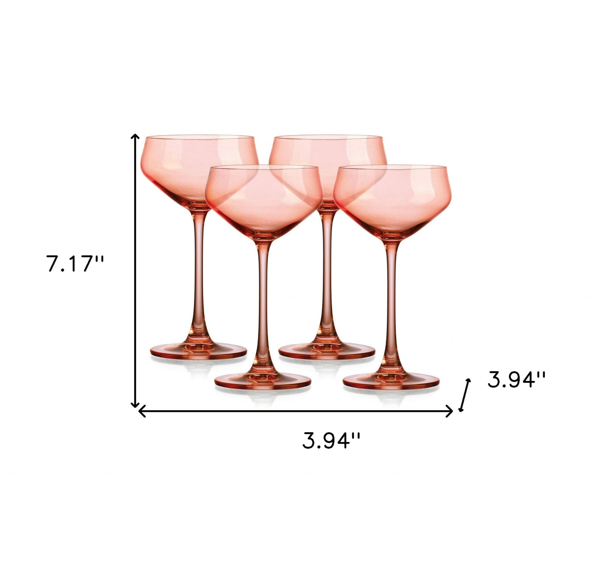 Add some fun and color to your entertaining space with this Set of Four Translucent Blush Coral Coupe Glasses. These 6oz colored glass stems with a coupe saucer shape have a clean and modern look with a fun colorful edge. Dishwasher safe, these fabulous glasses are great for cocktails and mocktails alike. Your next party is sure to be a hit with this gorgeous European glass with a colorful twist. 7.2" x 3.9" x 3.9