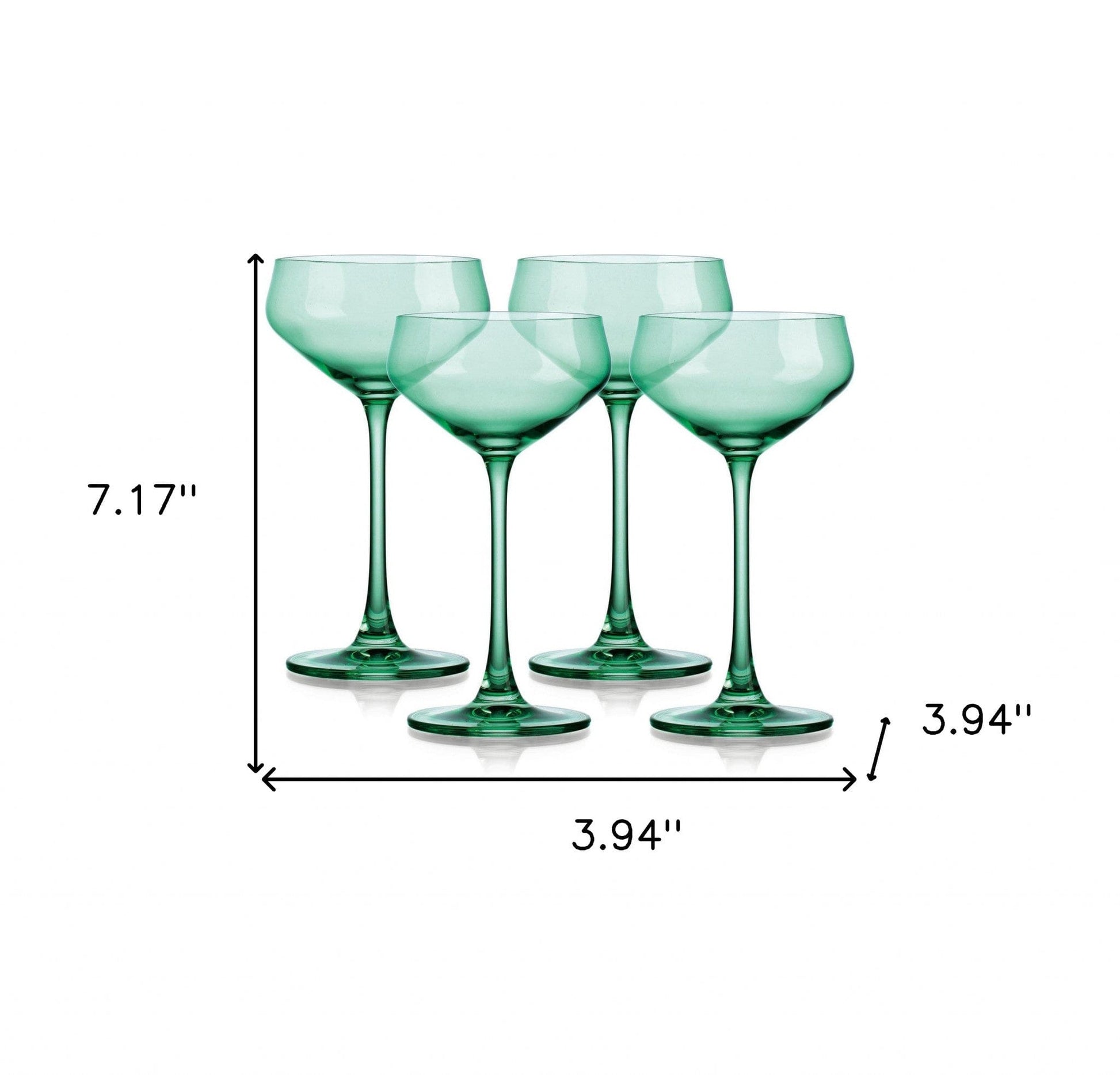Add some fun and color to your entertaining space with this Set of Four Translucent Pale Green Coupe Glasses. These 6oz colored glass stems with a coupe saucer shape have a clean and modern look with a fun colorful edge. Dishwasher safe, these fabulous glasses are great for cocktails and mocktails alike. Your next party is sure to be a hit with this gorgeous European glass with a colorful twist. 7.2" x 3.9" x 3.9