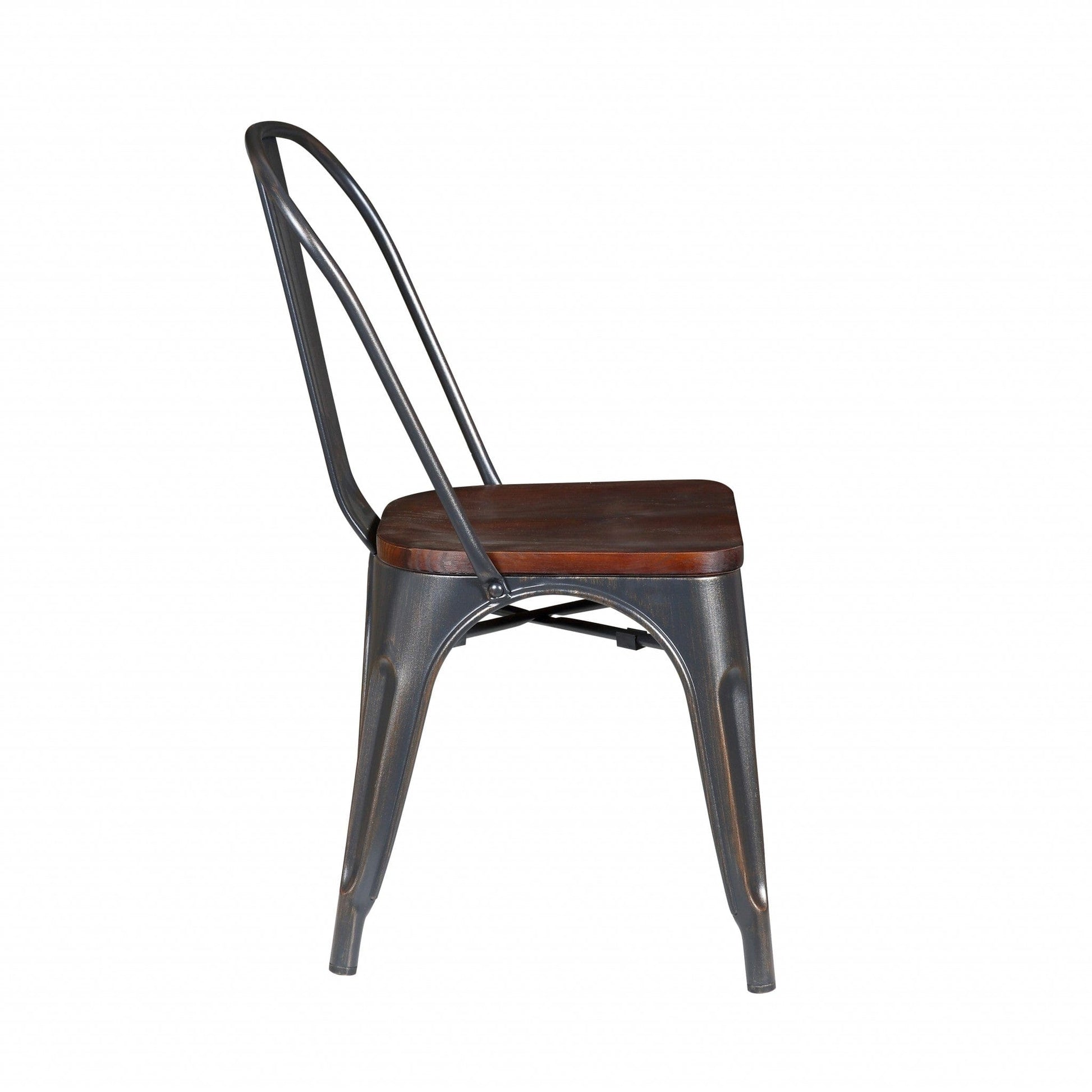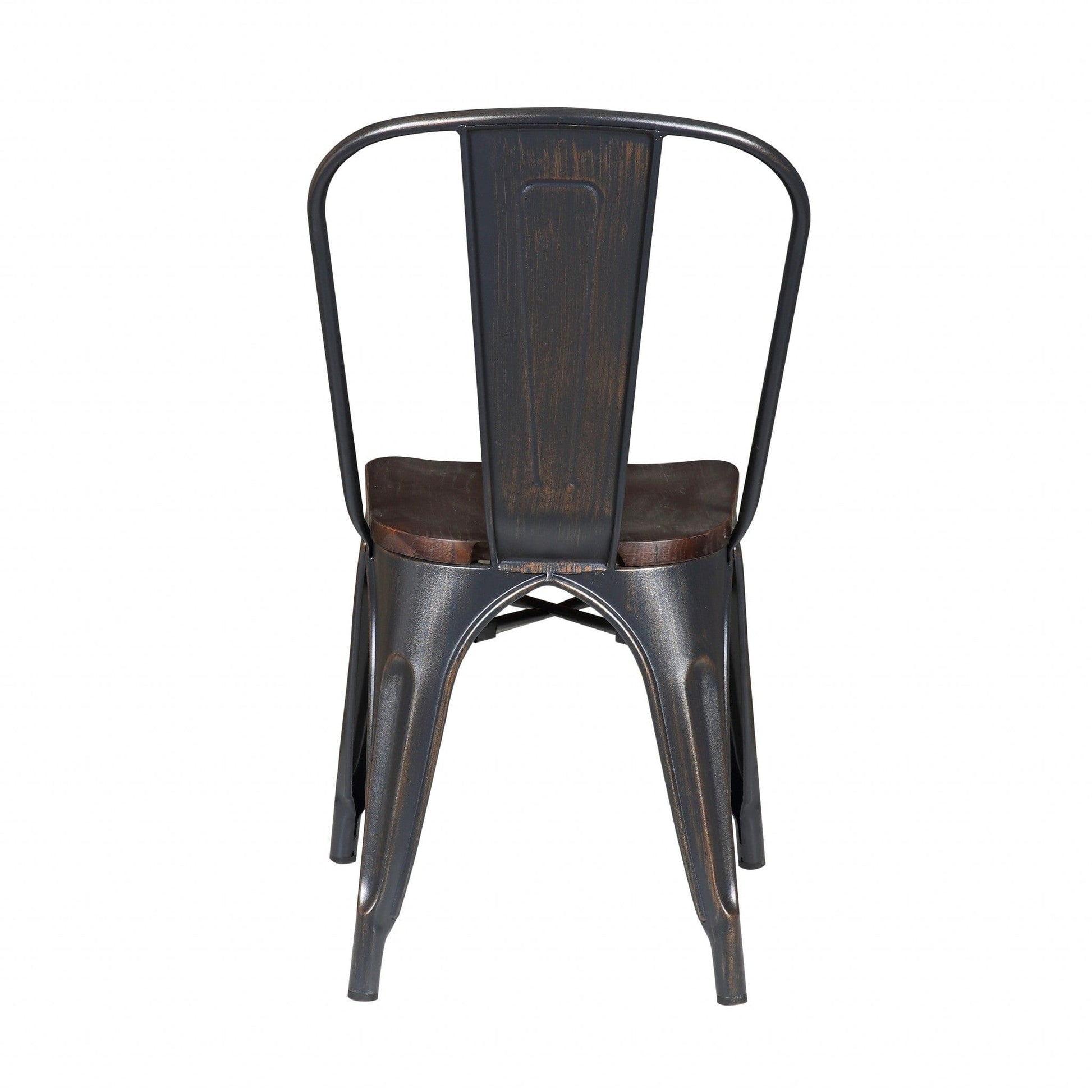 An ode to industrial and hospitality design, this Set of Four Vintage Style Restaurant Black and Walnut Dining Chairs will add character to any space in your home. There are four chairs in this set which can be stacked for easier storage. The frame of the chair is made from steel that is colored to an antiqued black distressed finish that allows shades of gold to come through. The legs have a tapered shape where the wider top parts connect to each other creating the seat holder. The back has a simple curved design with a central support beam which has carved line details. The seat is made from solid wood and is finished off with a natual dark brown stain. These chairs will look great as dining chairs, or as accent chairs in your living room, bedroom or office. 32.68" H x 17.72" W x 20.87" D