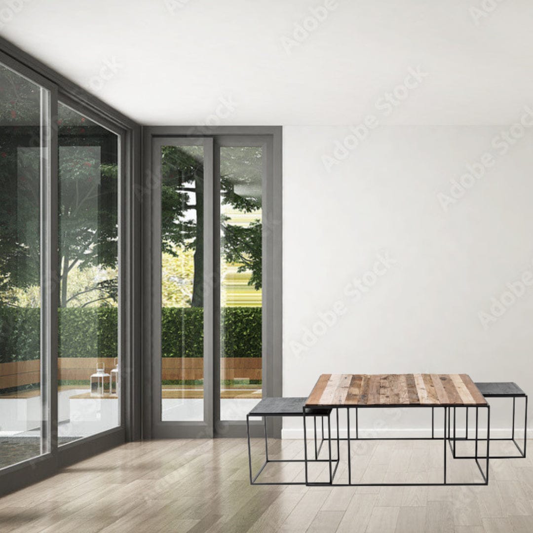 Set of Three Black and Brown Reclaimed Wood And Iron Nested Coffee Tables