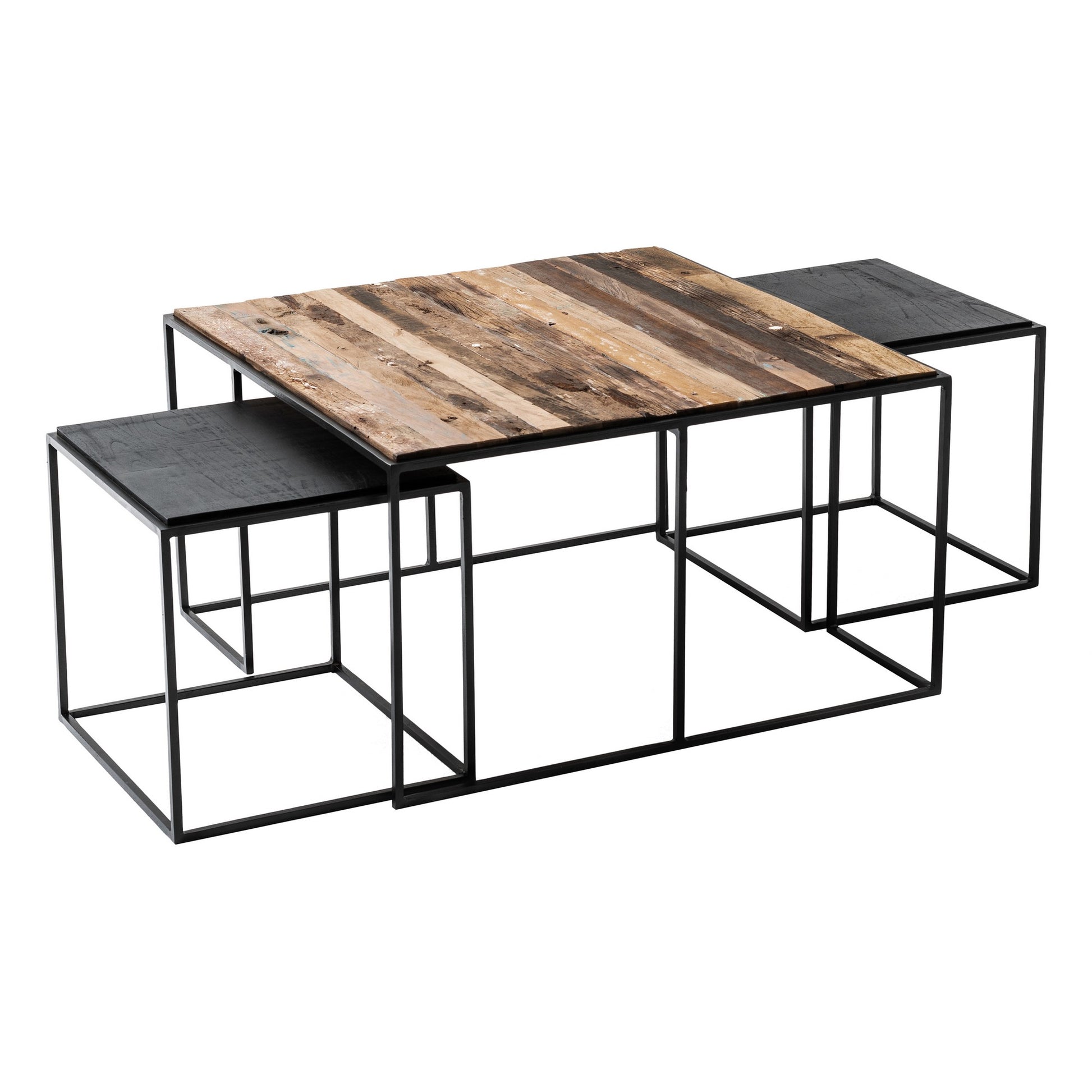 Save more space for your modern or contemporary home style with this Set of Three Black and Rustic Natural Nesting Tables, that you can use in various ways. The rustic natural brown wood color of the larger tabletop is great for a coffee table size, while the smaller black tables are great for end or side tables. The open and airy geometric black frams, give a modern industrial vibe and are a great visual contrast with the rustic textured and distressed tabletops. Crafted from wood, recycled boat wood, and a solid steel black frame to provide durability and fashionable modern look. These beautiful nesting tables will be a savvy addition to any of your home designs, you can use these in handy and convenient ways of maximizing your space, and nesting them back to create a stylish look and tidy feel. 17.72” X 31.5” X 31.5”