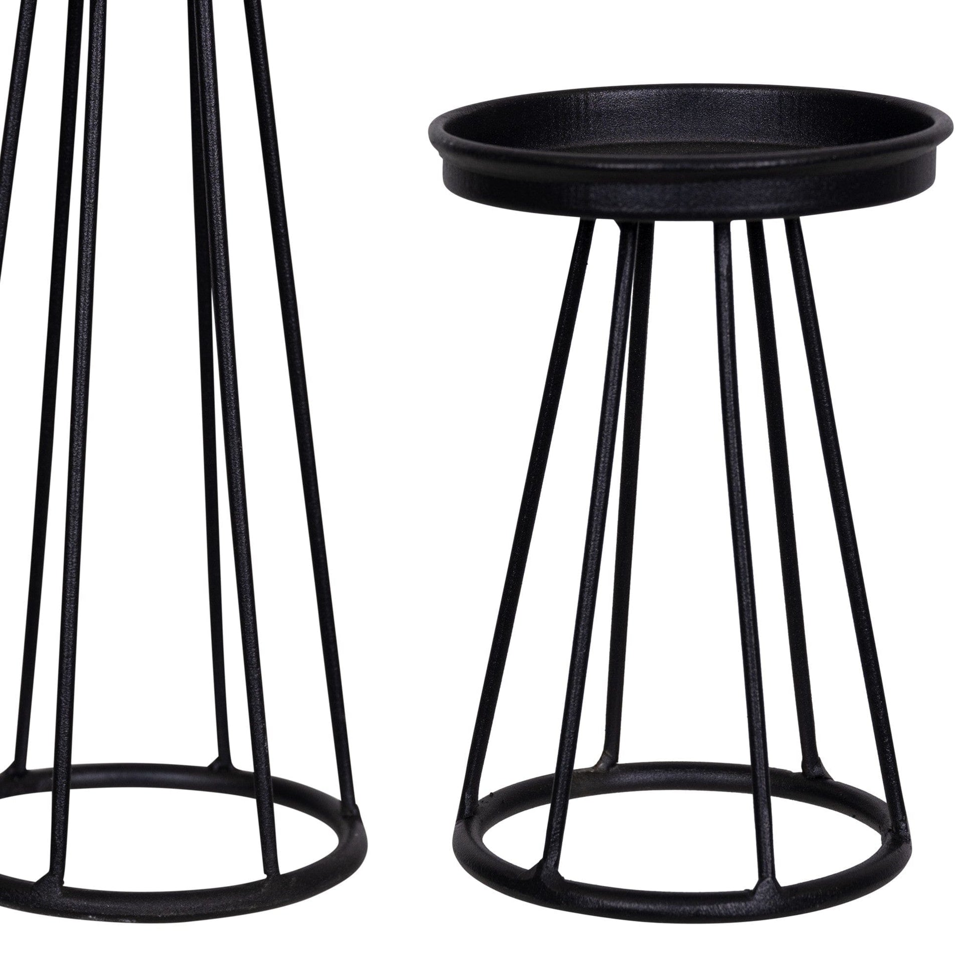With this Set of Three Black Metal Candle Holders you can bring in a touch of modern design that will elevate your space easily. There are three candle holders in this set in varying sizes made of solid metal and colored to a black finish. Each candle holder has the same design with a hollow circular base out of which there are metal rods coming and narrowing towards the top. The top has a plate inspired shape with curved edges perfect for holding large or small candles. You can use these candle holders in one place or you can break the set up and use them around your home. 10" H x 4" W x 4" D