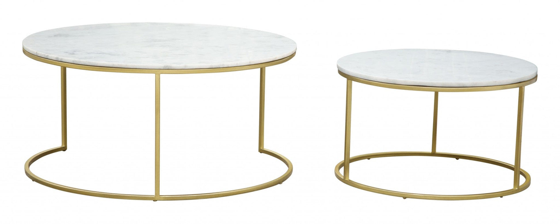 Show off your exquisite taste with this set of two 36" gold and white round nested coffee tables. The nesting feature is a great space saver for when not in use. This round table utilizes its unique shape to give your room a modern geometric accent. If you're looking for something that can fit into a living area, bedroom, or office, this coffee table is for you. This coffee table is the sturdy, reliable and stylish answer to your living room needs. 17.5" H x 36" W x 36" D
