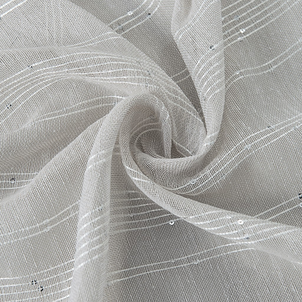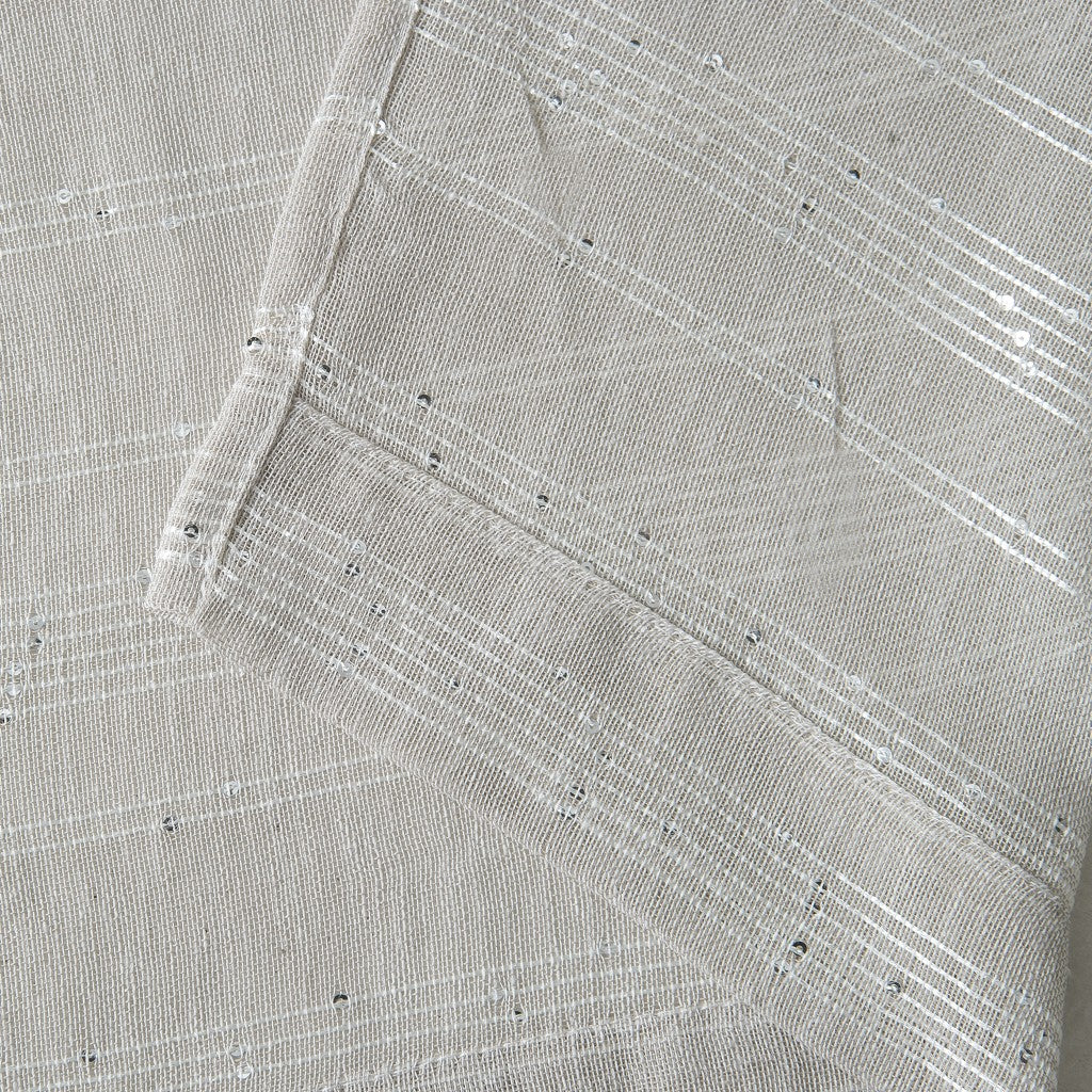 Add a subtle glam to your interior décor with this Set of 2 96” Beige Shimmery Window Curtain Panels that simple yet alluring to update your home. These set of semi sheet curtains in beige is embellished with shimmery sequined stripes to add texture to the piece with a sparkly effect. This set of curtains will perfectly cover any standard-sized window of your bedroom, living room, or guestroom, letting soft light flow through for a cozy ambiance. Made from quality polyester fabric to ensure durability and a soft feel on the touch. The silver grommets add a clean touch to the curtains and make installation absolutely hassle-free. Easy to care and maintain, you can machine wash the curtain in cold water and hang it dry to retain the shape. If you’re into style and simplicity, look no further than this pair of window curtains to adorn your contemporary space. 96” x 76”
