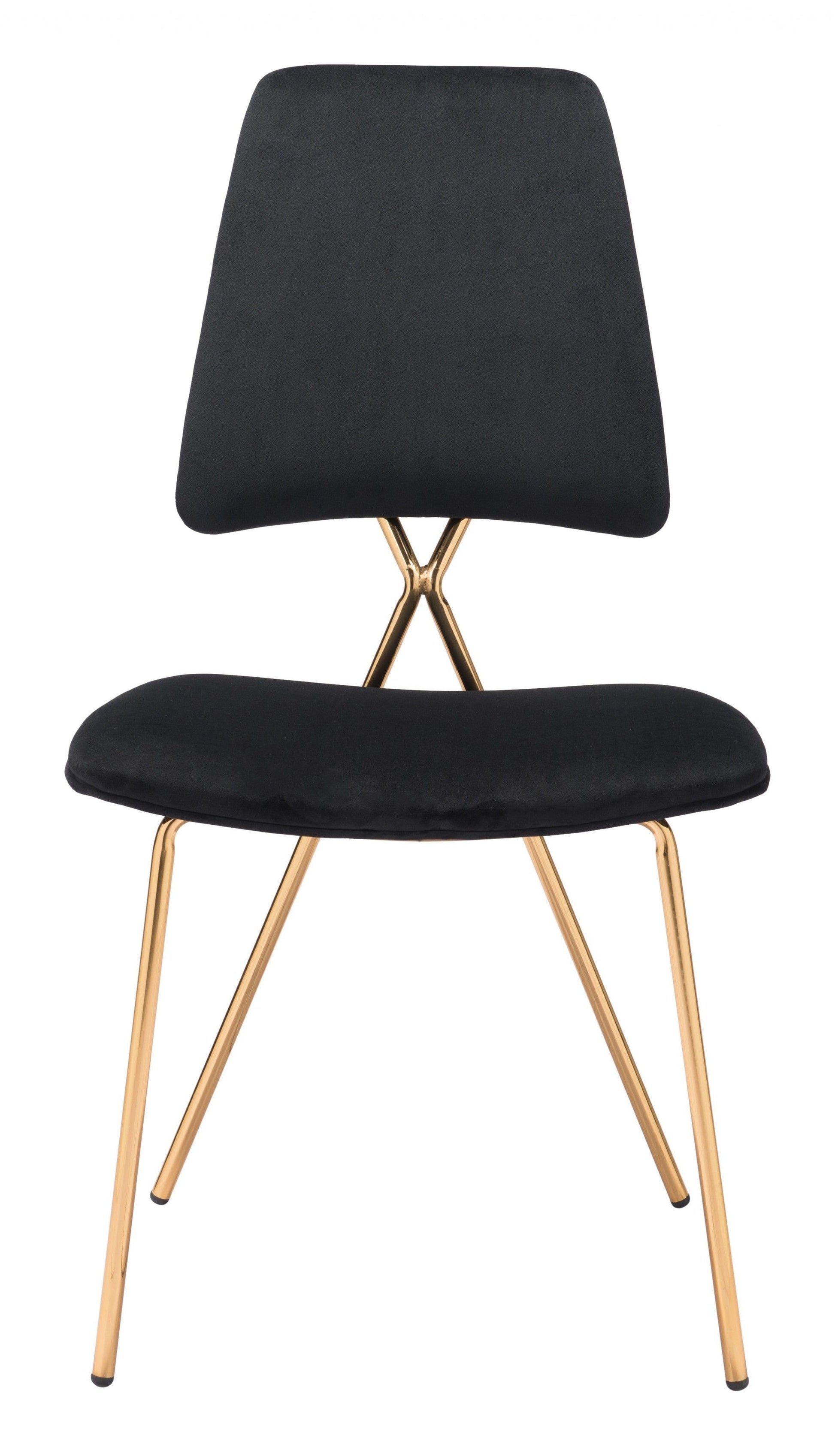 With a subtle hint of vintage these Black and Gold Modern X Dining Chairs bring a luxurious and bold vibe to your space. A geometric X design frames the sturdy stainless steel back and base is carried off in a rich looking gold hue. The separate seat and back support are covered in a lusciously soft polyester upolstery that is durable and is a great offset to the shiny gold tone of the legs. Added around the dining table or as an accent in your living room or bedroom these chairs will be a winner where ever they are placed. 35.8" x 19.7" x 21.9" each. Set of 2.