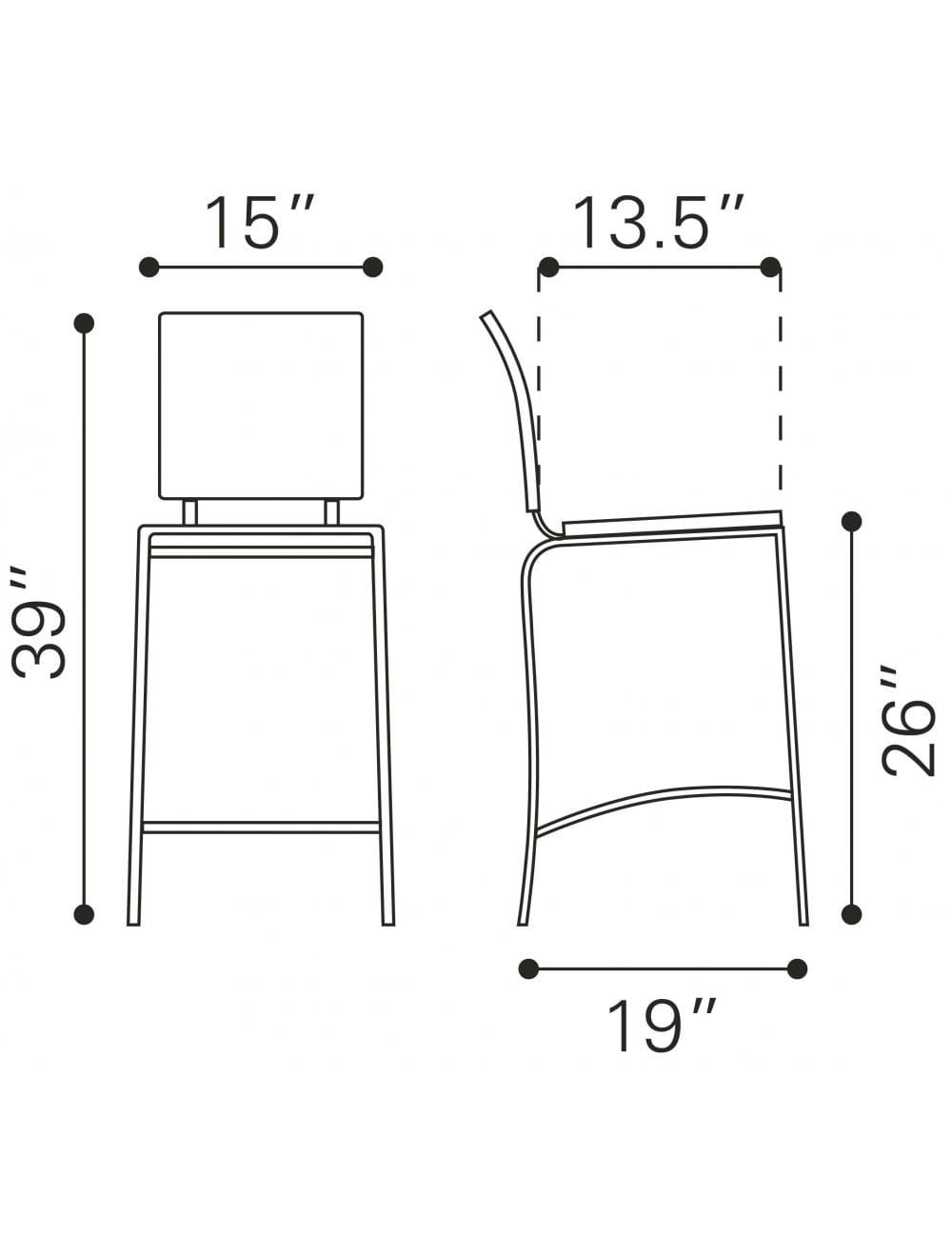 A modern twist on a classic design this pair of Modern Basket Weave Counter Height Chairs are a great way to set your kitchen or bar area for entertaining and everyday enjoyments. Made of shiny stainless steel the sturdy base includes a convenient footrest and has a unique arched bottom support that adds some visual interest. The seat itself is a solid cushioned faux leather square while the backrest is tightly woven with wide strips in the same faux leather that form a baseketweave design. 39" x 15" x 19" each. Set of 2.