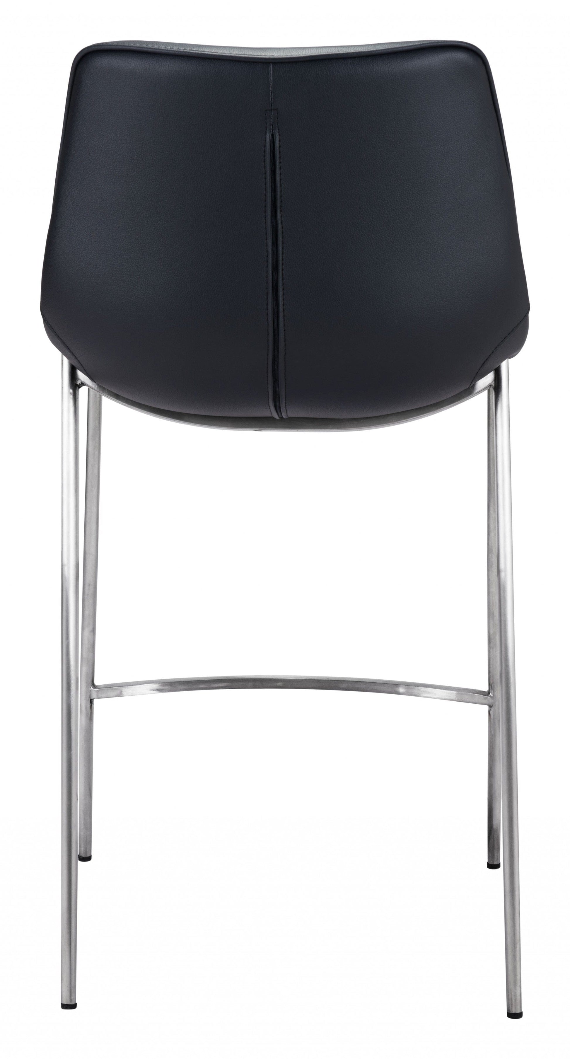 Beautiful and elegantly casual these Black Faux Leather and Stainless Steel Modern Stitch Bucket Counter Height Chairs are a modern way to accent your kitchen living room or bar lounge area. The stainless steel base with comfort footrest is finished in a modern brushed stainless silver finish. The soft and comfortable chair features high end stitching details and comes in a heavy duty supple black faux leather that makes these chairs look rich modern and slightly edgy. 39.8" x 20.7" x 21.7" each. Set of 2.