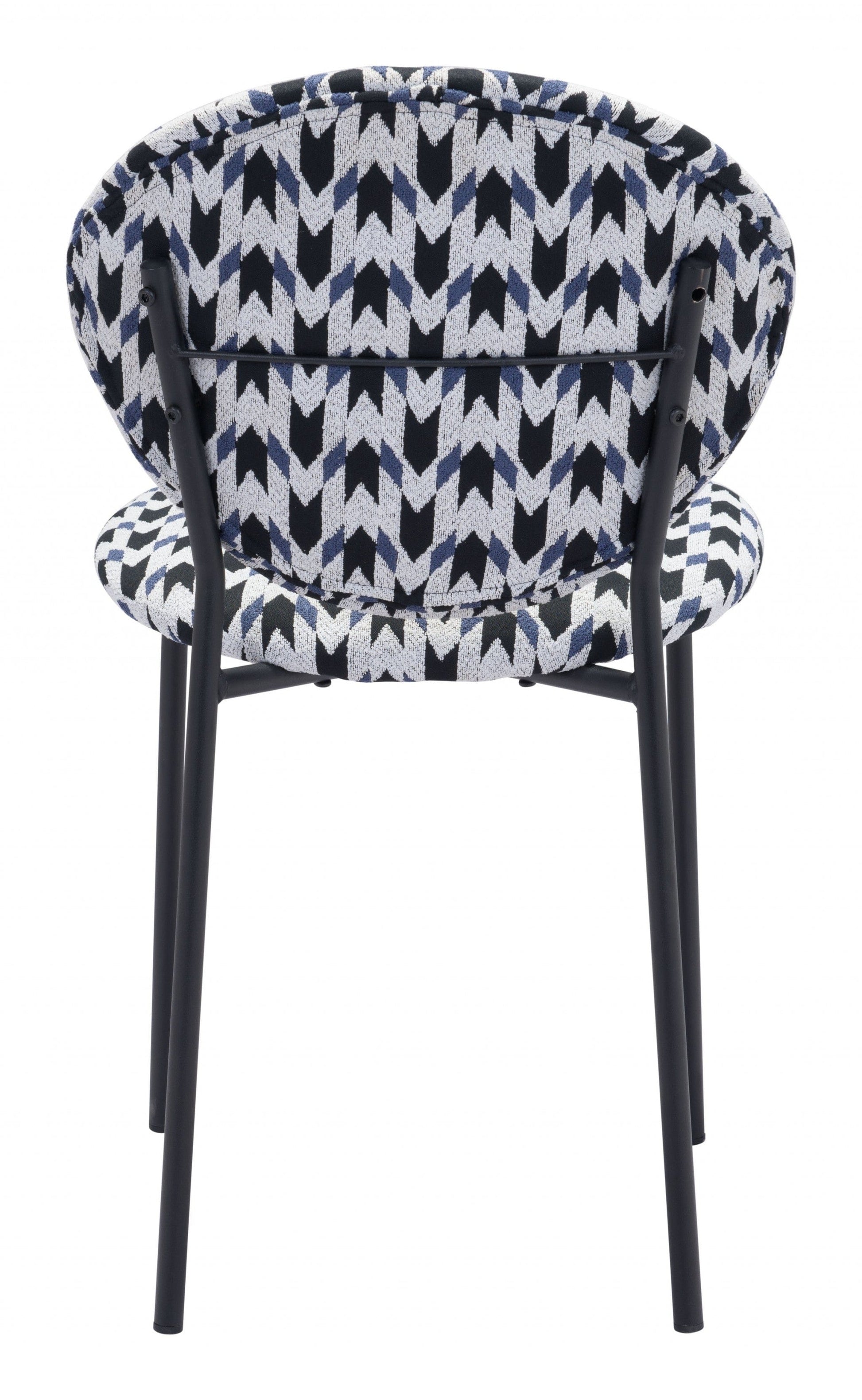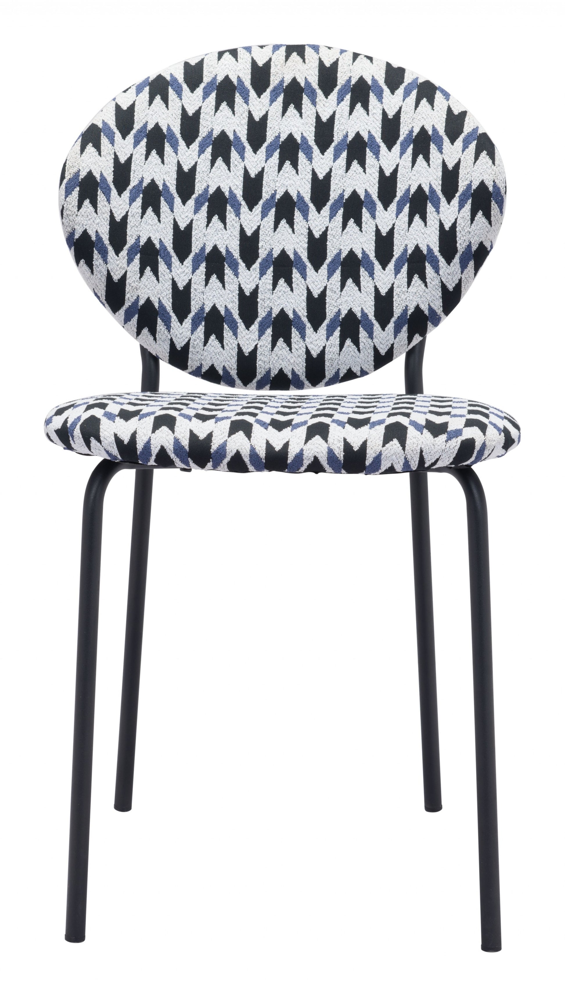 Breath some life into your space with these Blue Black and White Arrow Design Dining or Side Chairs. With a clean and contemporary shape these decorated chairs a unique way to add a bit of pizazz to your home or office. The stainless steel legs in a matte black finish marry nicely with the textured abstract all over arrow design in blue and black on a white background. The unique decorated look is a great way to spice up the kitchen dining room office living room or bedroom. 32.3" x 18.1" x 23.6" each. Set of 2.