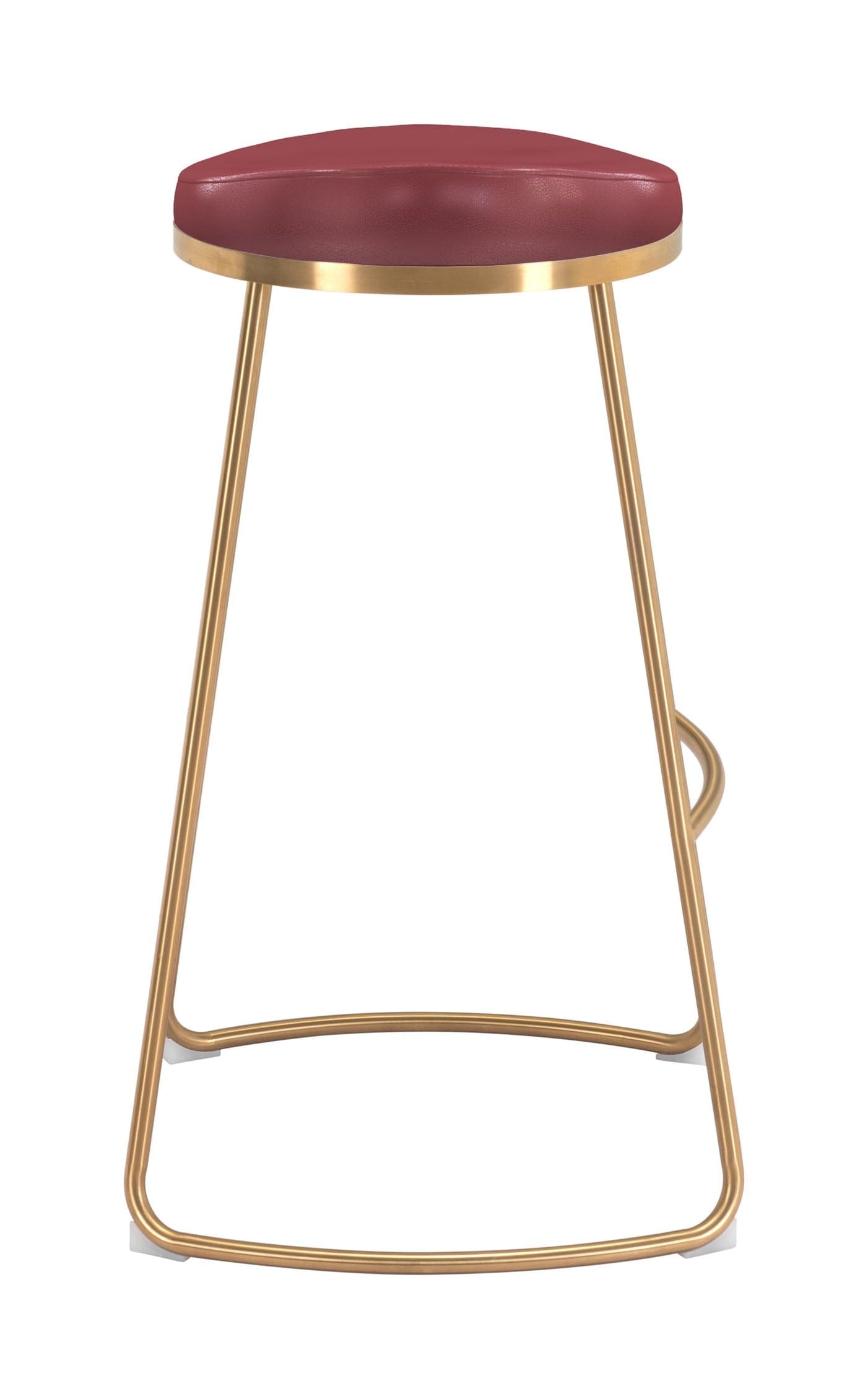 These Modern Glam Geo Backless Barstools aim to please even the most discerning fashionistas. The sturdy solid stainless legs and base have gorgous curve to them to form an open airy geometric base that is then finished in a glamorous and warm gold tone. The soft and supple burgundy faux leather seat has just the right amount of cushiony padding and a slight curve to it for the ultimate in comfort. To finish off the look and add to the comfort factor there is a convenient front footrest. Enjoy your time hanging out with family and friends on these great stools. 30.5" x 20.3" x 17.5" each. Set of 2.