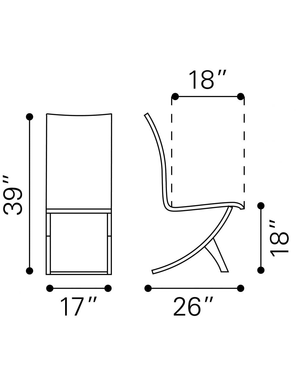Bring sophisticated and modern flair to the dining room with these Contempo Slim Faux Leather and Stainless Dining Chairs. Elegant in a unique way these chairs have a arched non-traditional shiny chrome base that makes these chairs stand out. The tall yet narrwod backrest and seat are covered in a soft faux leather and have an ever so slight curvature to them that make them not only comfortable but good looking as well. A fabulous way to set the table but could also be used as accent chairs in a modern living or office setting. 39" x 17" x 26" each. Set of 2.
