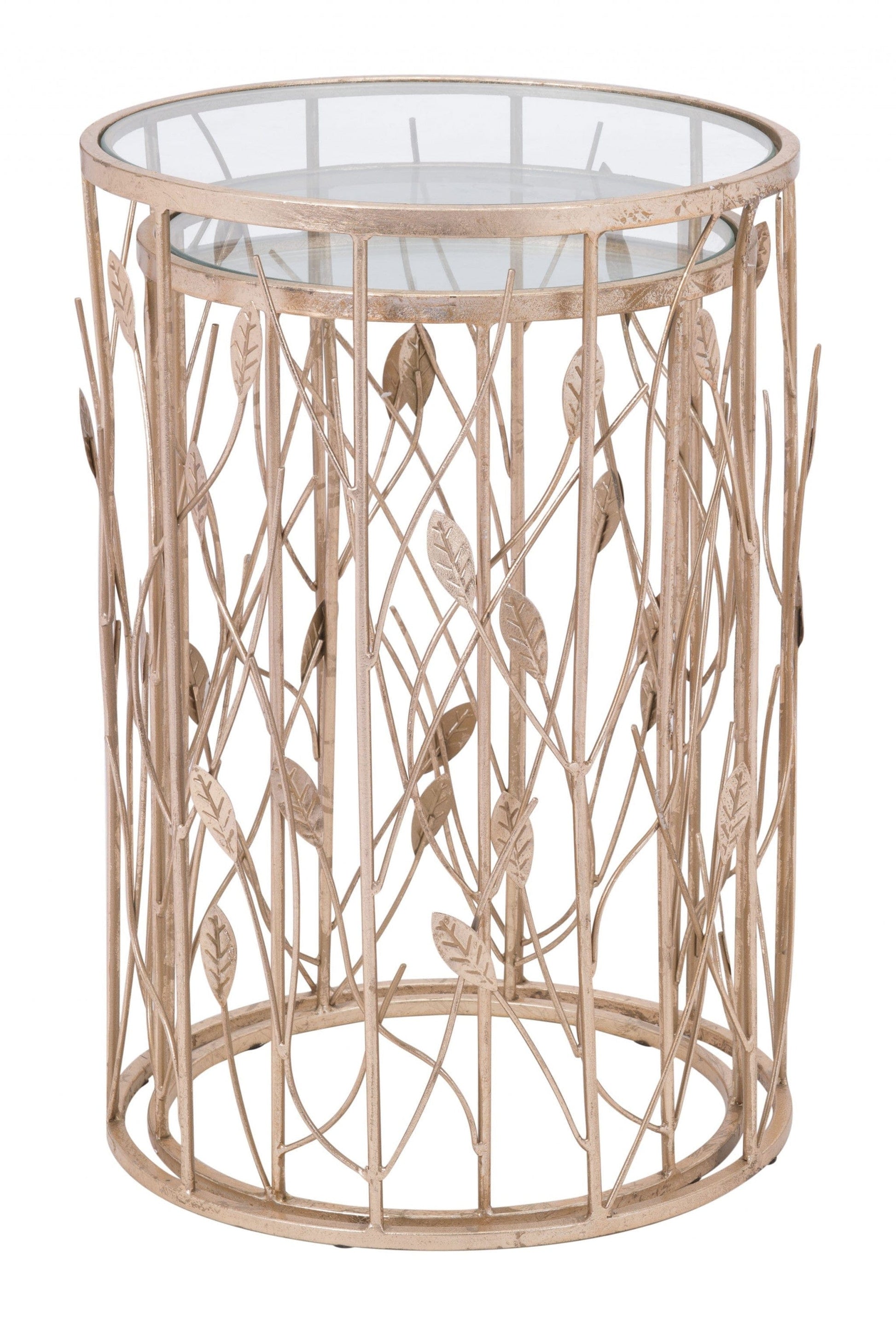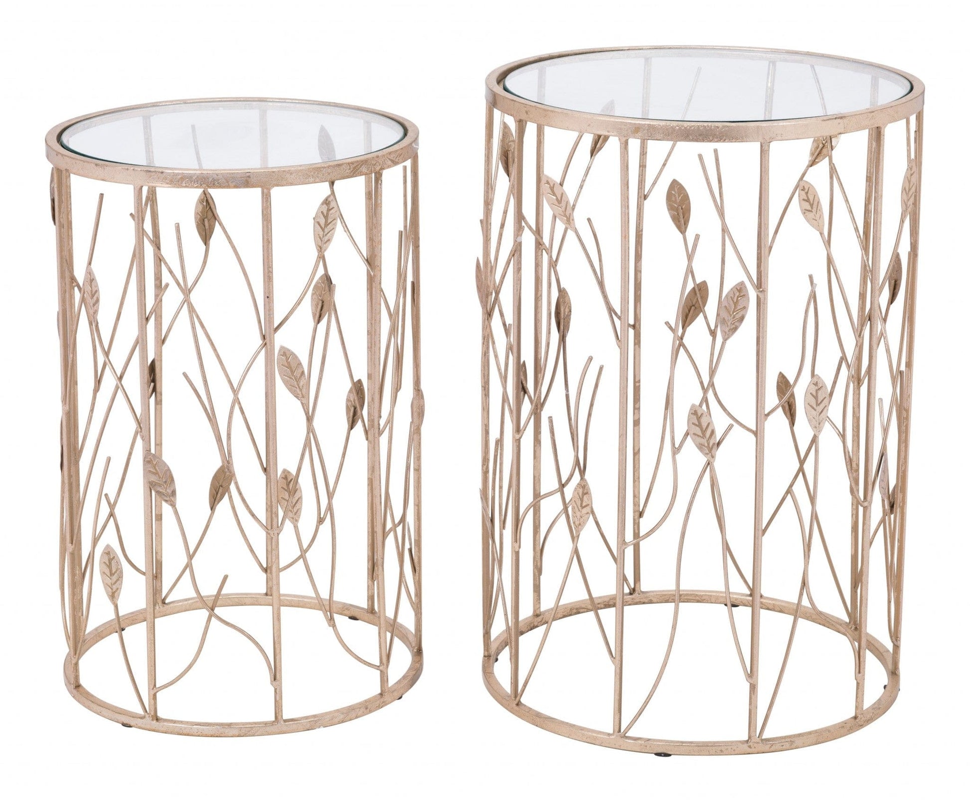 Bring in a touch of contemporary design to any space in your home with this Set of Two Leaf Gold and Glass Side Tables. There are two side tables in this set which are made from solid metal. The base of each table has a circular shape to which there are four rods attached. Through these rods there are leaf covered vines passing creating a unique base. The bases are colored to a dull gold finish. The table tops are made of glass and add a nice lightness to the overall look. You can use these tables together or break them up and create cohesion with your interior style. 22" H x 15" W x 15" D