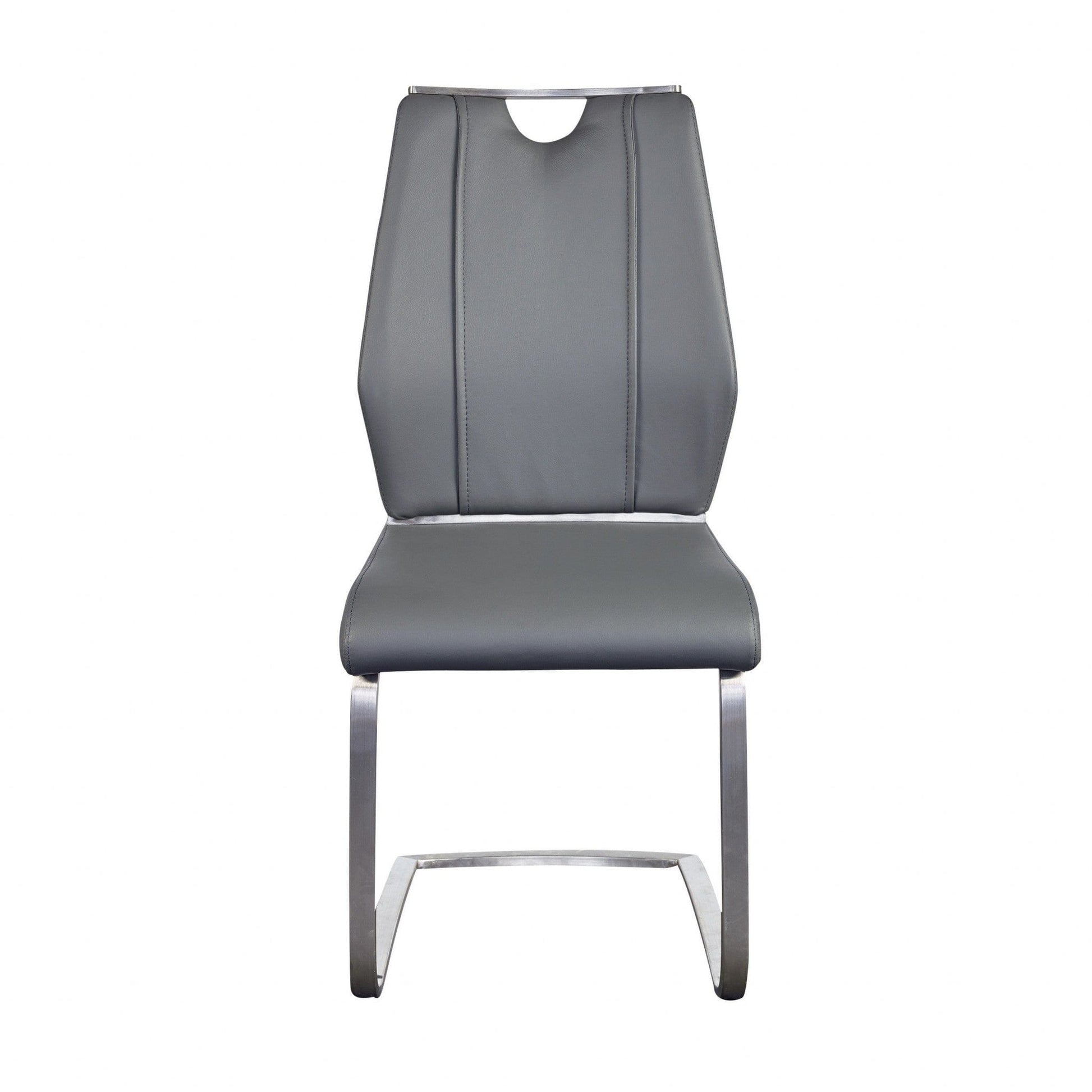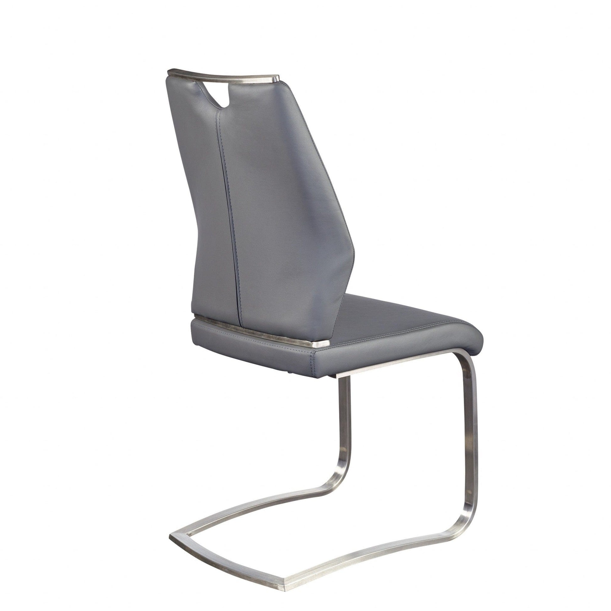 A seating solution that provides utility and style at the same time, this Set of Two Light Gray Leather Cantilever Chairs will elevate the look of any space in your home. There are two chairs in this set which have steel frames and fabric covered seat and back cushions. The base has a cantilever design which makes each chair look unique. The cantilever shape is made of flat steel rods and colored to a silver finish. The seat and back are covered in a light gray faux leather which is soft and durable. The back has a long shape which gets slightly wider in the middle and has a semi-circle cutout design at the top. The seams add just the right amount of detail. Use these chairs as dining chairs, office chairs, or even as reading chairs. 39.57" H x 17.72" W x 22.05" D