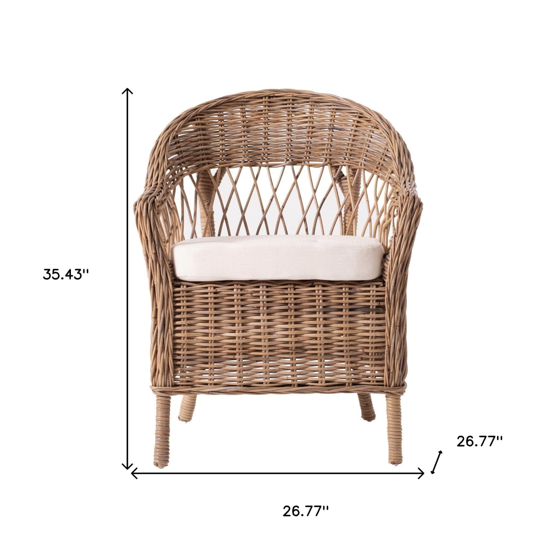 Bring lush texture to any of your home design styles may it be boho, traditional, modern, or contemporary style, with this Set of Two Semi Circle Back Wicker Arm Chairs with Seat Cushion, will showcase the natural beauty of your space. Visually having natural materials in your home is shown to increase your mood and vibe. The gorgeous natural gray light brown color of the rattan visually brings neutrality and balance to your space. Handcrafted from Kubu rattan these sturdy and good looking chairs are a great casually elegant way to set your space. Each comes with a thick, neutral, creamy white soft cushion, made from 100% cotton, for a cozy and inviting feel. This set of chairs is perfect for relaxing in your lounge, living room, dining room, or bedroom. 35.43" H x 26.77" W x 26.77" D