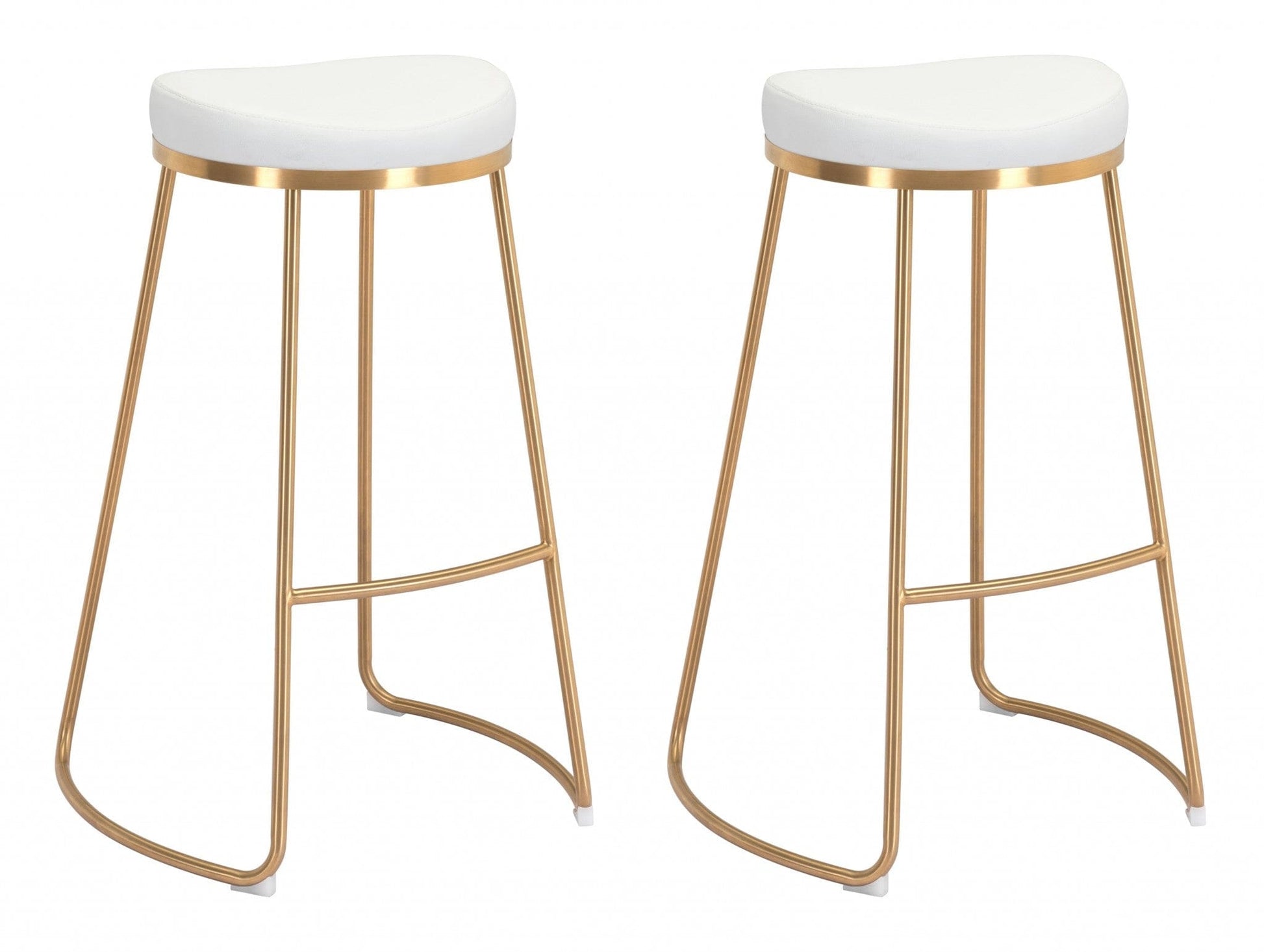 These Modern Glam Geo Backless Barstools aim to please even the most discerning fashionistas. The sturdy solid stainless legs and base have gorgous curve to them to form an open airy geometric base that is then finished in a glamorous and warm gold tone. The soft and supple white faux leather seat has just the right amount of cushiony padding and a slight curve to it for the ultimate in comfort. To finish off the look and add to the comfort factor there is a convenient front footrest. Enjoy your time hanging out with family and friends on these great stools. 30.5" x 20.3" x 17.5" each. Set of 2.