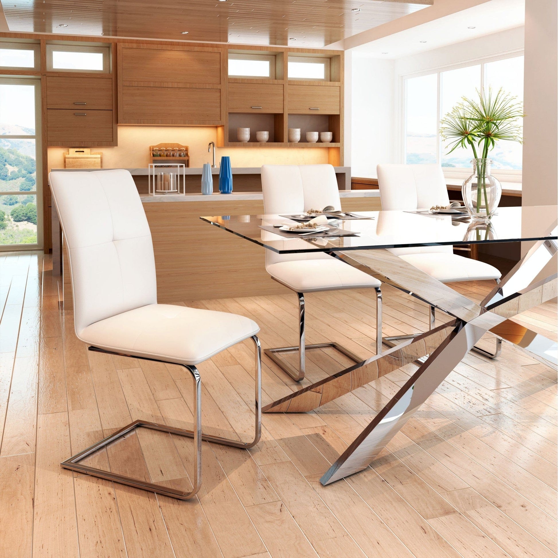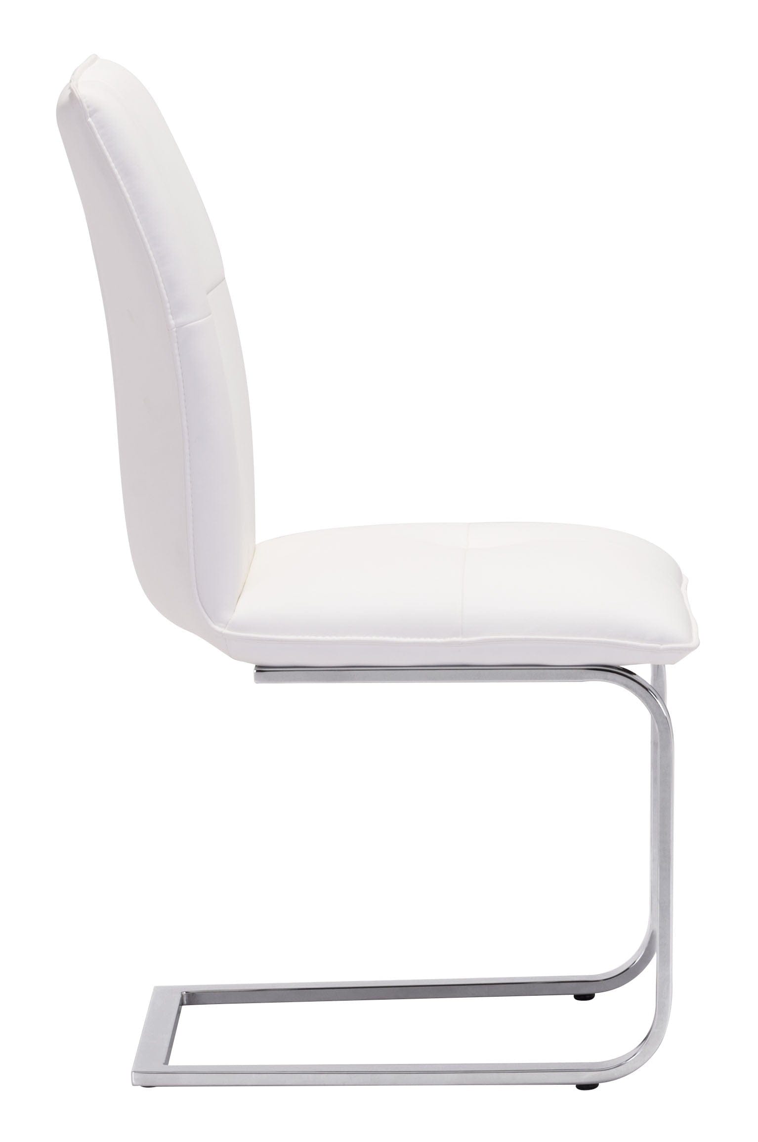 The White Faux Leather and Chrome Contempo Comfy Dining Chairs are a great way to set your dining table with some modern flair. The slim armless silhouette has just the right amount of give to make this chair not only sleek contemporary looking but super comfortable as well. The faux leather seat and back have tufted detailing to add to the look while the shiny chrome steel base is visually interesting and unique with an open geometric design. 37" x 17" x 23.4" each. Set of 2.