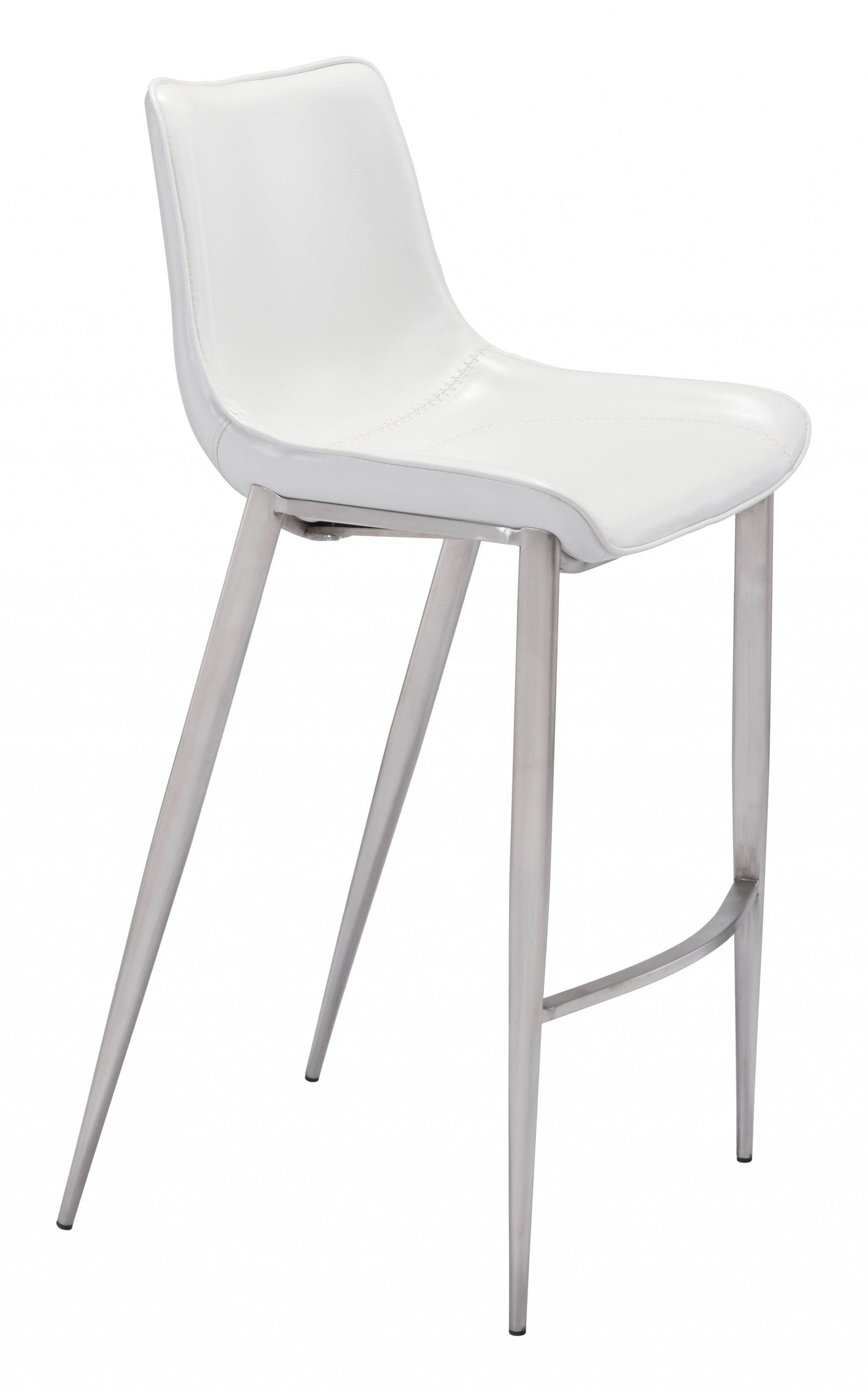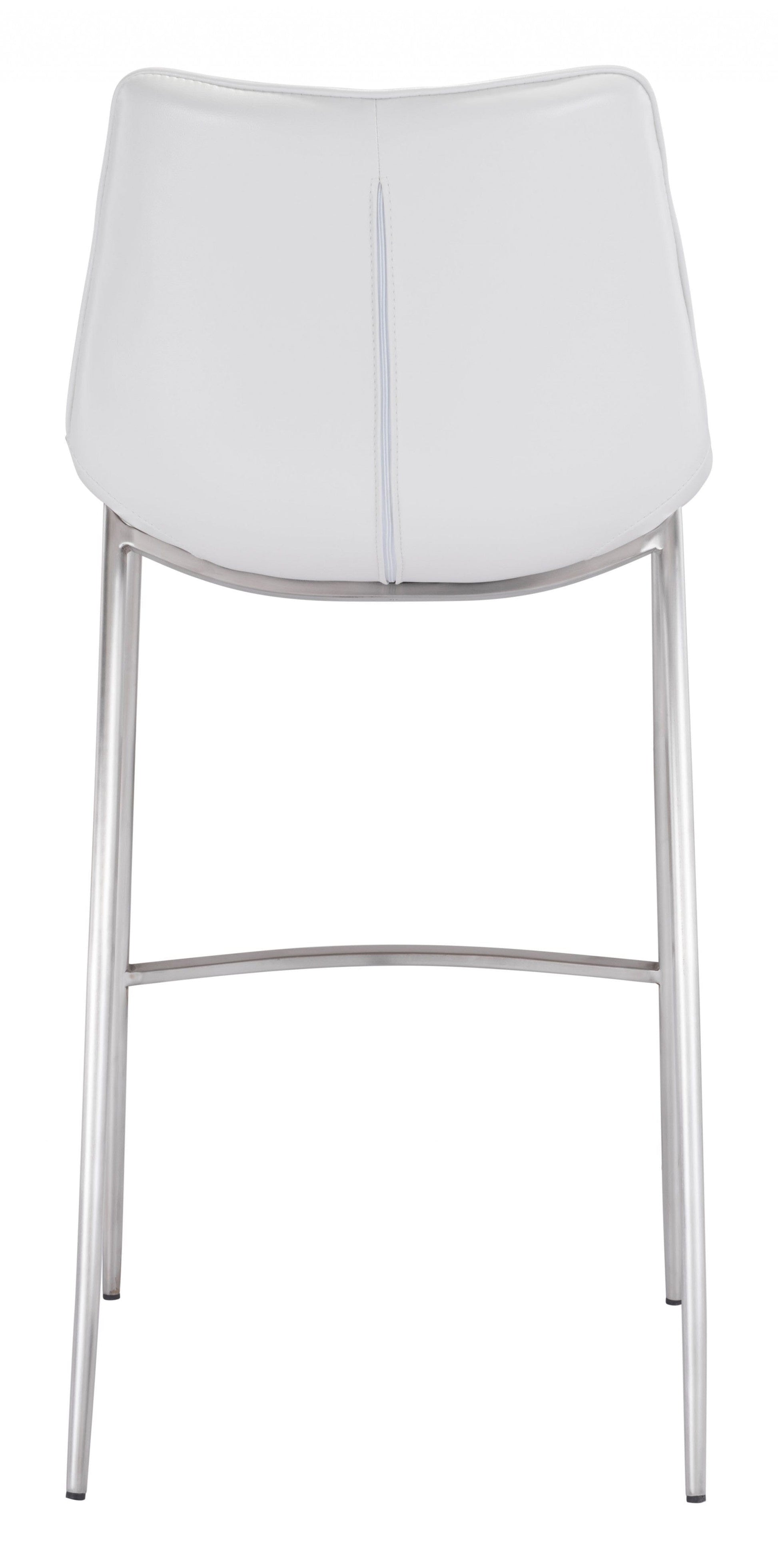Beautiful and elegantly casual these White Faux Leather and Stainless Steel Modern Stitch Bucket Bar Height Chairs are a modern way to accent your kitchen living room or bar lounge area. The stainless steel base with comfort footrest is finished in a modern brushed stainless silver finish. The soft and comfortable chair features high end stitching details and comes in a heavy duty supple white faux leather that makes these chairs look rich modern and slightly edgy. 43.3" x 20.7" x 21.7" each. Set of 2.