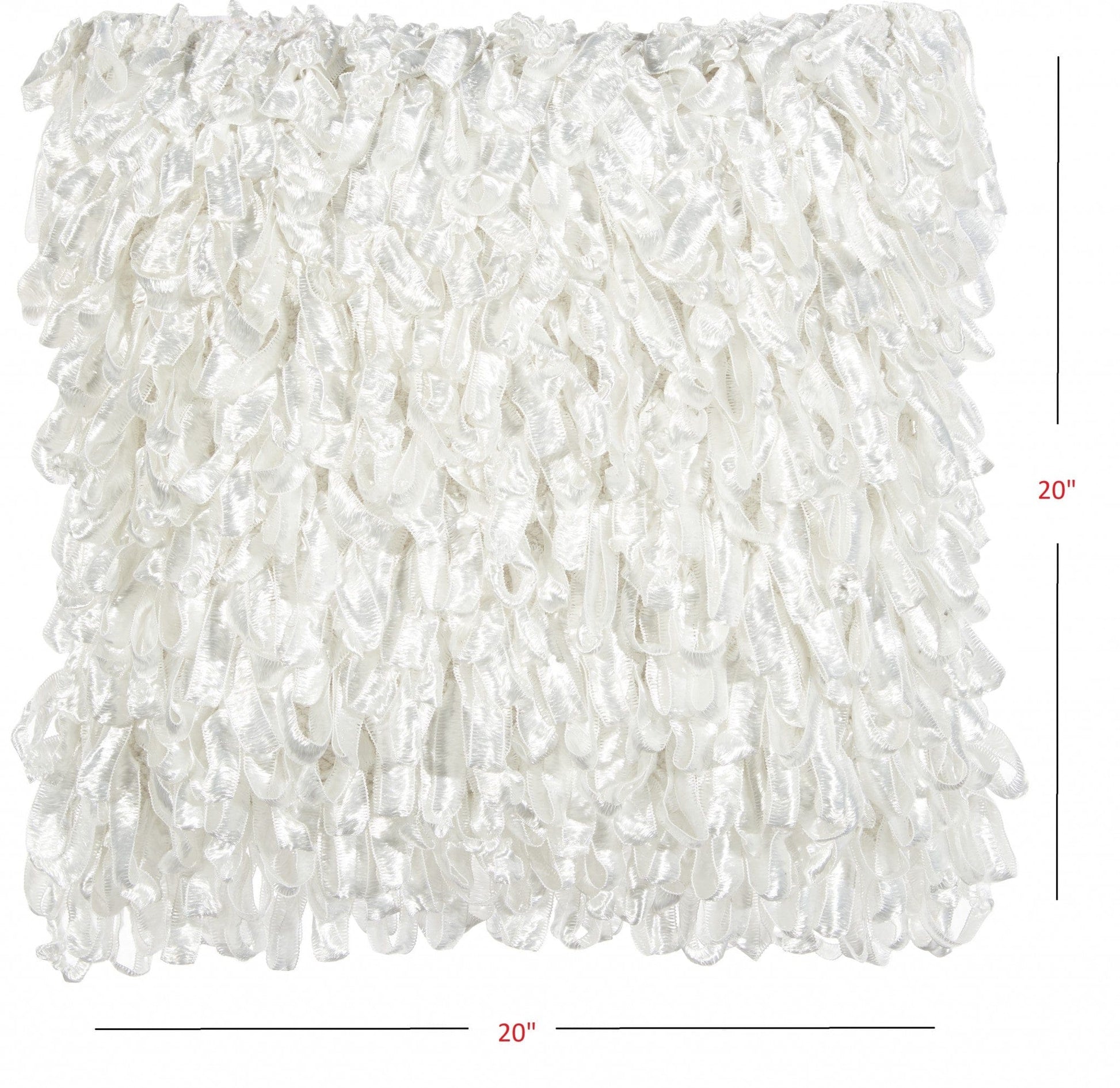 This Shiny White Shaggy Throw Pillow is a great way to add some textural design to any seating space in your home. This pillow has a square shape and is covered in a shaggy fabric in a white color which shines silver in different lights. The shag has a longer length to it which adds depth and dimension to the overall look and will elevate any space you choose to use this pillow in. Display it on your bed, add it to the existing pillows on your couch, or make it a stand-alone piece on your favorite chair - the options are endless. 5" H x 20" W x 20" D