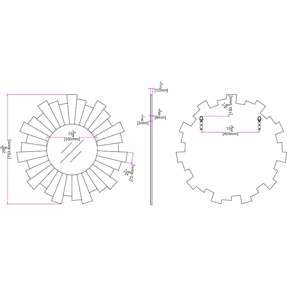 A great statement piece for your home, this Silver Sunshine Wall Mirror is a striking way to complete your space. A round mirror in the center gives way to mirrored panels around, forming a contemporary sunburst design that makes this mirror bold and unique. High quality design and materials make this a great choice to add some dimension and style to your decor. 30" x 30"