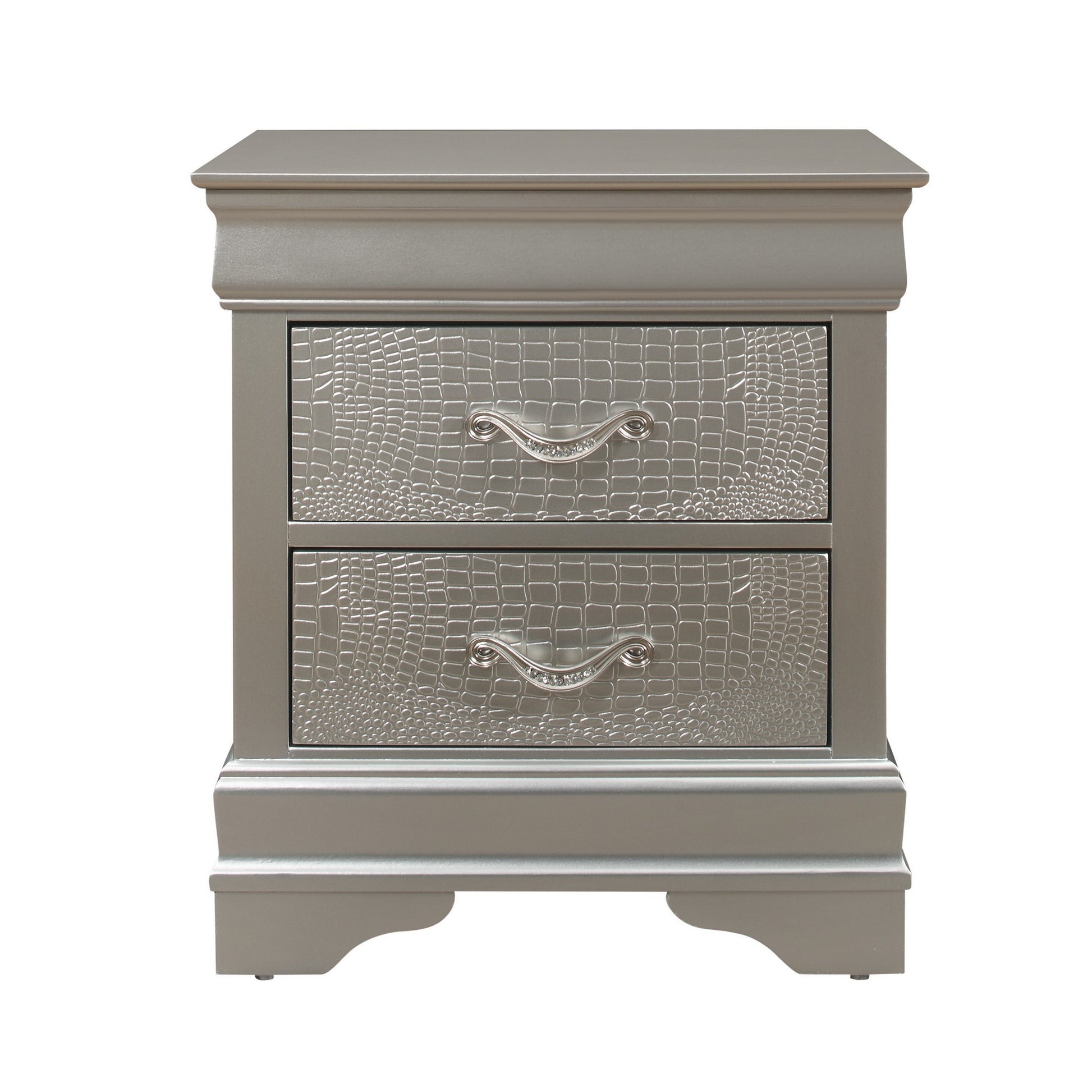 A luxuriously appointed nightstand that will help you create an oasis of comfort and relaxation in your home. This nightstand features a gorgeous blend of silver tones, making it a fitting choice for most room decors. This dresser incorporates several It including clean lines, 2 drawers, croc embossed drawer fronts, and silver hardware complete with rhinestone detailing. It is constructed utilizing utilizing solid rubberwood. Quality craftsmanship in every facet of production ensures durability and long-lasting wear. This nightstand is the perfect way to make your bedroom comfortable and inviting.