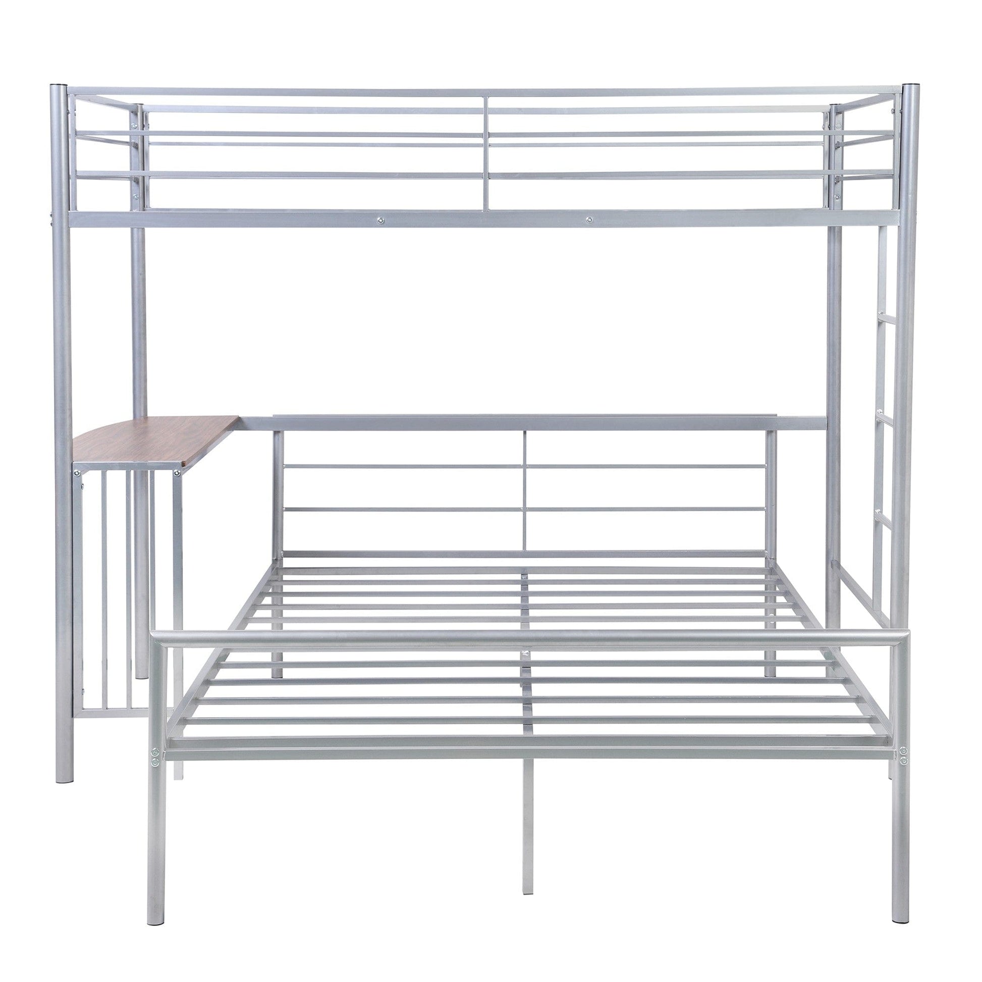 Eye-catching and super convenient, the Silver Twin Over Full Size Metal Bunk Bed with Desk is a brilliant solution for upgrading your children's or young teenager's bedroom. This super simple yet elegant bunk bed f eatures a twin size bed on top of a Full Size bed. The bottom bed can be used separately freeing up the space beneath the top bunk bed for playing or studying on the built-in desk. Both bed frames are made for premium quality metal tubes with smooth and modern gray finish and come equipped with metal slats - so you dont have to buy box springs. 65"H x 78"W x 41"D