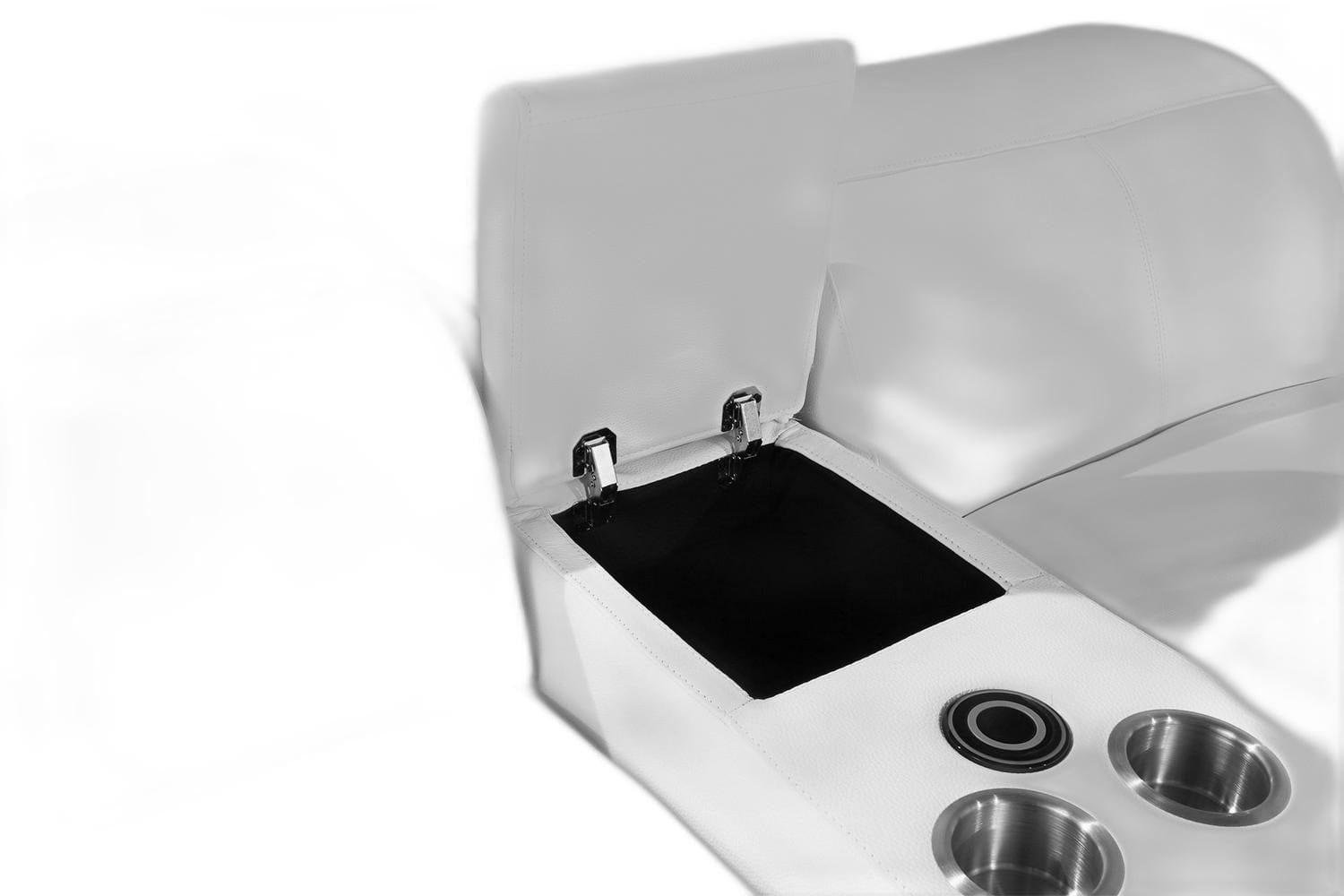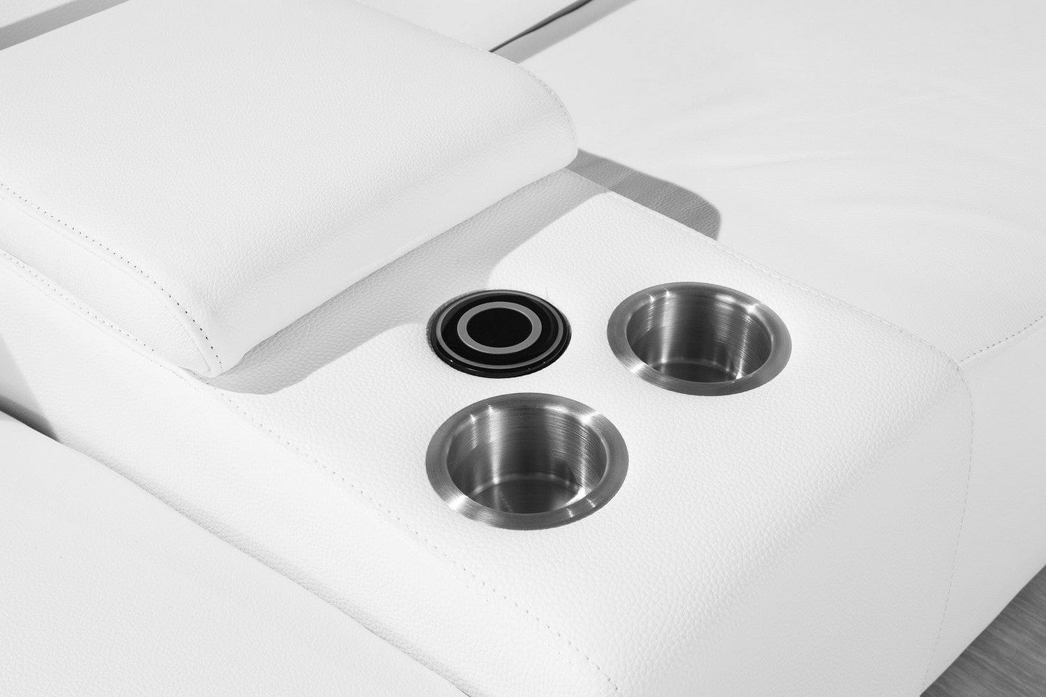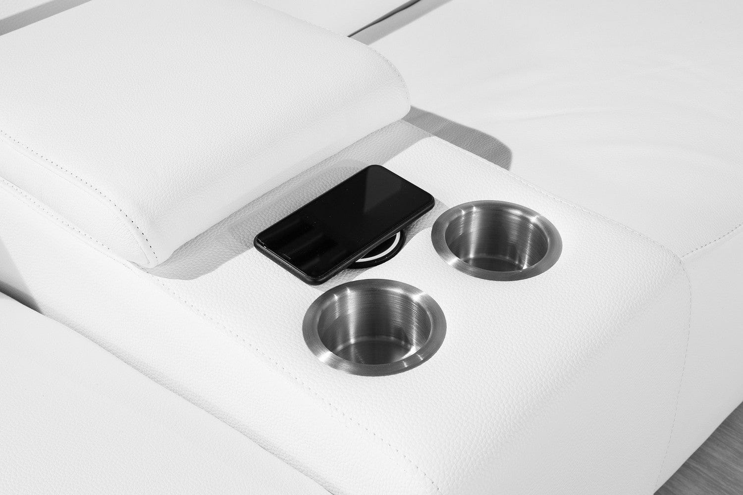 Sit back, relax and enjoy your favorite book or show while relaxing on this beautiful power reclining sectional. High quality construction with the finest genuine Italian Leather and the ability for three people to power recline, makes this a premium choice for your living room or family room. Chrome feet offset the soft and supple cloud like white leather to give this set a contemporary look and feel. Complete with a single console cabinet for hidden storage and cup holders, this sectional is aimed for comfort.