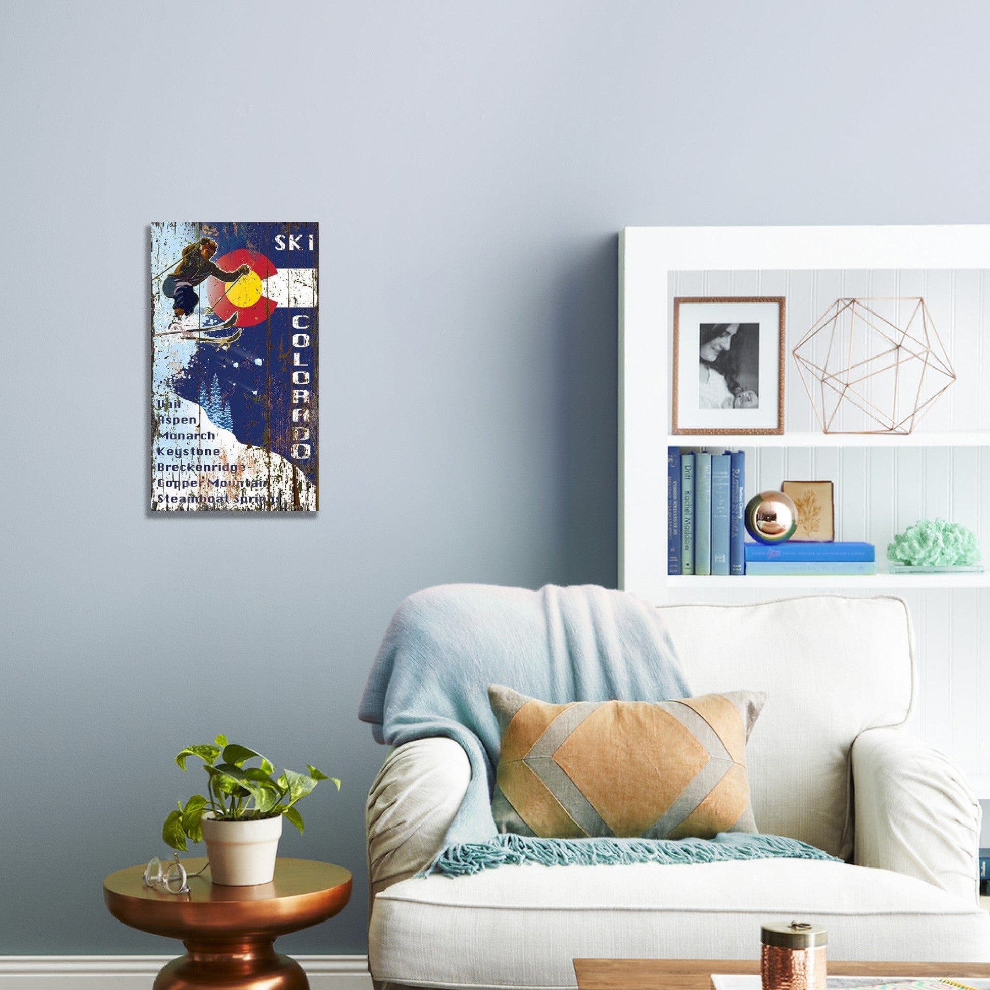 Rustic and imperfect by design, this Skiing into the Colorado Flag Wall Decor is a unique and colorful way to bring some vintage Colordao memorabilia to your space. The vintage faded colors of red, blue, white and gold make the Colorado flag stand out. This vintage wall art is a unique addition to any mountain house, ski house, living space, or bedroom. 26" x 15" x 2".
