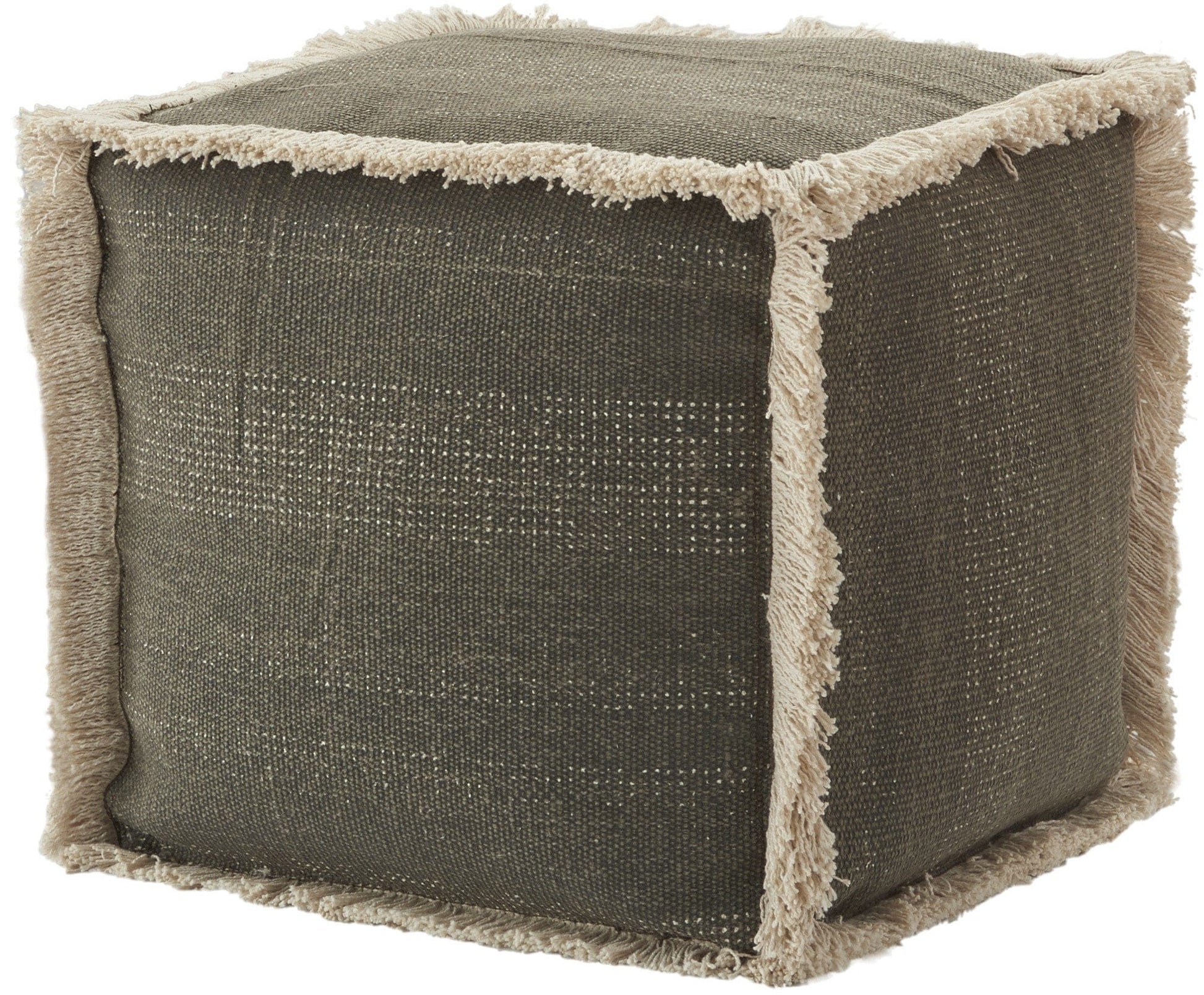 Add a design winner to your space with this Slate Textural Shaggy Edge Pouf Ottoman. A great piece to use as an ottoman, extra seat, or add a tray to use as an end or coffee table. This square pouf has textured charcoal slate woven fabric with super soft ivory shaggy yarn trim down each of the edges to give it a super cool and chic look. A fun and easy accent that can move from room to room as needed, this cube pouf is a great idea. 16" x 16" x 16"