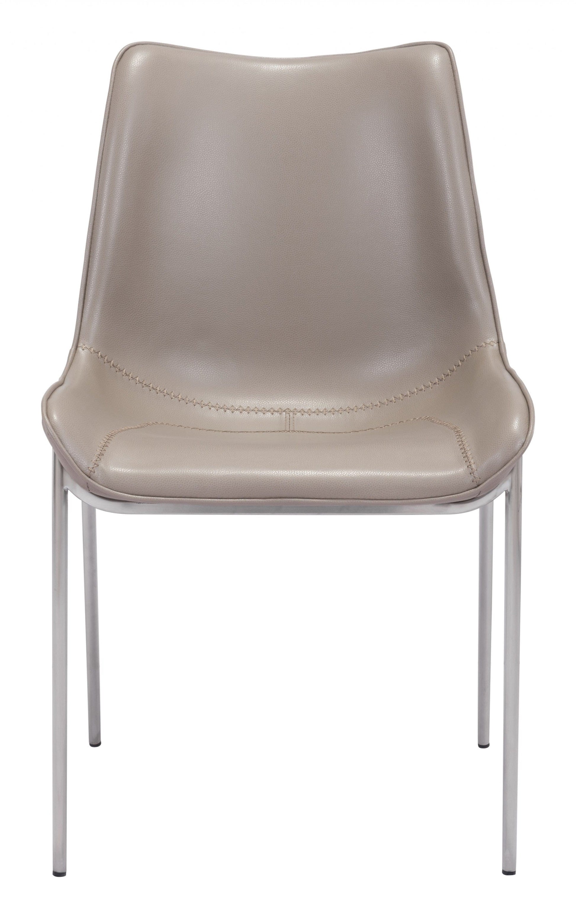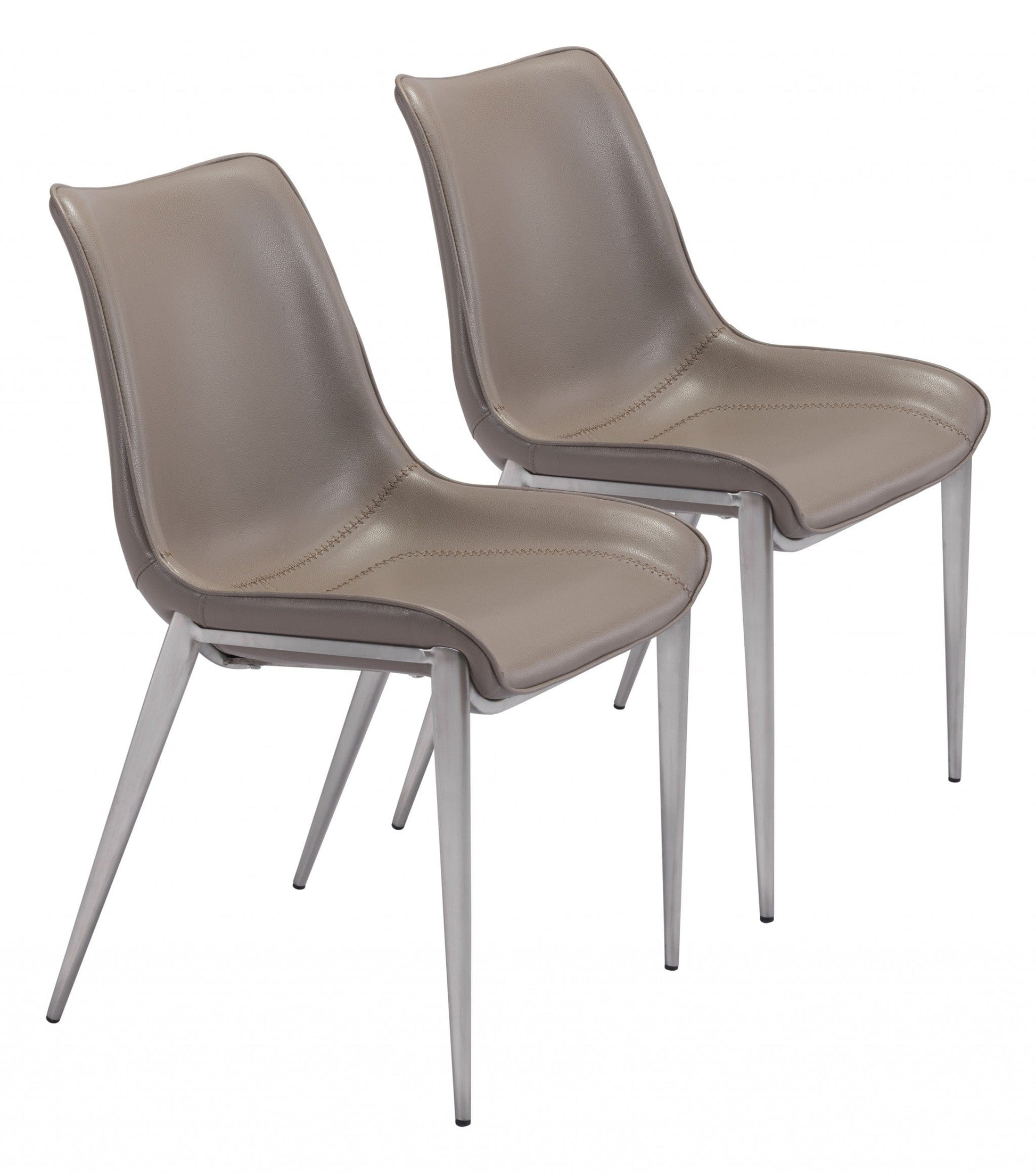 The perfectly designed transitional chair our Stitch Gray Faux Leather Side or Dining Chairs are expertly designed to go from dining to office and anything in between. The shape of these chairs is a beautiful contour which hugs your body and the beatufiul stitching across the seat adds some dimension and interest. Comfortable enough to use as a desk chair. A brushed stainless steel base and legs add to the casualness of this chair that will help it to blend in with existing decor. Protective plastic feet keep your floors scratch free. Set of 2. 21.3" x 23.6" x 35.4" each.