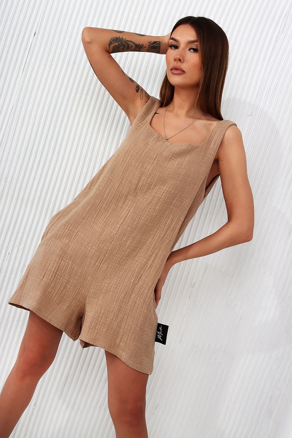 Short camellia jumpsuit made of extremely lightweight muslin fabric ideal for warm summer days. The model with a loose, oversized cut will work well on any figure..