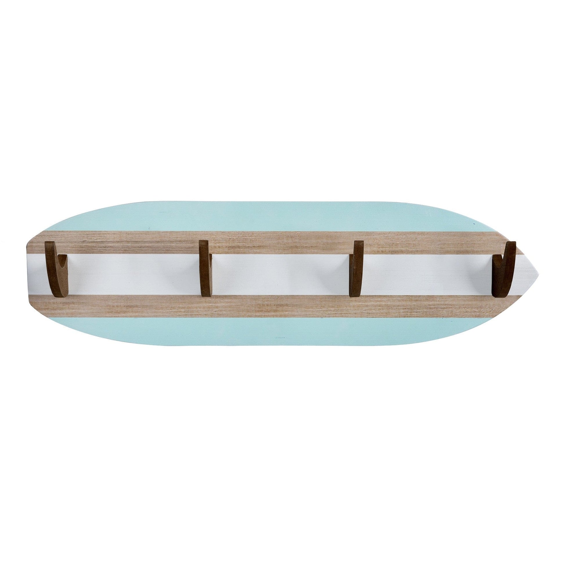 Hang Ten - actually Four, with these Surfboard Shaped Wall Hooks you can add a touch of summery beach bum design along with practicality to any wall in your home. There are four wooden hooks in a dark brown finish attached to a surfboard shaped wooden background. The top and bottom thirds of the surfboard background are in a pale blue color with a plain wood panel linking them to the white middle part with the hooks. You can use these hooks in your hallway, laundry room, bedroom, or even a kid's room to add a fun way to keep the clutter away. 8" H x 28" W x 3.94" D